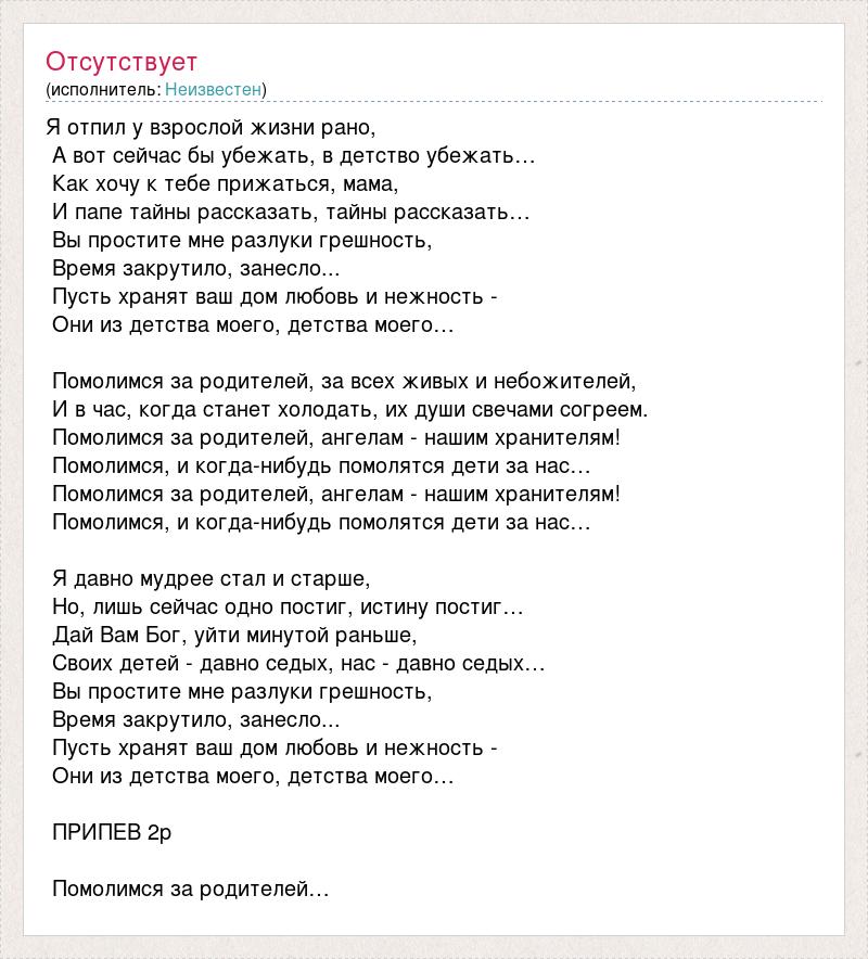 Я отпил у взрослой жизни рано, А вот сейчас бы убежать, в детство убежать… Как хочу к тебе прижаться, мама, И папе тайны рассказать, тайны рассказать… Вы простите мне разлуки грешность, Время закрутило, занесло... Пусть хранят ваш дом любовь и нежность - Они из детства моего, детства моего… Помолимся за родителей, за всех живых и небожителей, И в час, когда станет холодать, их души свечами согреем. Помолимся за родителей, ангелам - нашим хранителям! Помолимся, и когда-нибудь помолятся дети за нас… Помолимся за родителей, ангелам - нашим хранителям! Помолимся, и когда-нибудь помолятся дети за нас… Я давно мудрее стал и старше, Но, лишь сейчас одно постиг, истину постиг… Дай Вам Бог, уйти минутой раньше, Своих детей - давно седых, нас - давно седых… Вы простите мне разлуки грешность, Время закрутило, занесло... Пусть хранят ваш дом любовь и нежность - Они из детства моего, детства моего… ПРИПЕВ 2р Помолимся за родителей…