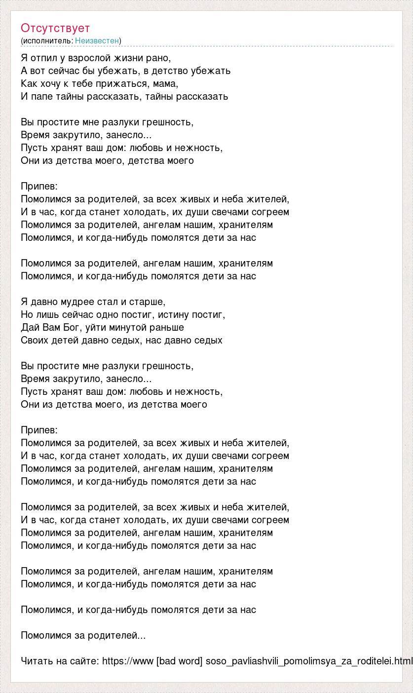 Я отпил у взрослой жизни рано, А вот сейчас бы убежать, в детство убежать Как хочу к тебе прижаться, мама, И папе тайны рассказать, тайны рассказать Вы простите мне разлуки грешность, Время закрутило, занесло... Пусть хранят ваш дом: любовь и нежность, Они из детства моего, детства моего Припев: Помолимся за родителей, за всех живых и неба жителей, И в час, когда станет холодать, их души свечами согреем Помолимся за родителей, ангелам нашим, хранителям Помолимся, и когда-нибудь помолятся дети за нас Помолимся за родителей, ангелам нашим, хранителям Помолимся, и когда-нибудь помолятся дети за нас Я давно мудрее стал и старше, Но лишь сейчас одно постиг, истину постиг, Дай Вам Бог, уйти минутой раньше Своих детей давно седых, нас давно седых Вы простите мне разлуки грешность, Время закрутило, занесло... Пусть хранят ваш дом: любовь и нежность, Они из детства моего, из детства моего Припев: Помолимся за родителей, за всех живых и неба жителей, И в час, когда станет холодать, их души свечами согреем Помолимся за родителей, ангелам нашим, хранителям Помолимся, и когда-нибудь помолятся дети за нас Помолимся за родителей, за всех живых и неба жителей, И в час, когда станет холодать, их души свечами согреем Помолимся за родителей, ангелам нашим, хранителям Помолимся, и когда-нибудь помолятся дети за нас Помолимся за родителей, ангелам нашим, хранителям Помолимся, и когда-нибудь помолятся дети за нас Помолимся, и когда-нибудь помолятся дети за нас Помолимся за родителей... Читать на сайте: https://www [bad word] soso_pavliashvili_pomolimsya_za_roditelei.html