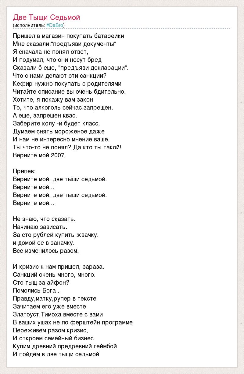 Пришел в магазин покупать батарейки Мне сказали:"предъяви документы" Я сначала не понял ответ, И подумал, что они несут бред Сказали б еще, "предъяви декларации". Что с нами делают эти санкции? Кефир нужно покупать с родителями Читайте описание вы очень бдительно. Хотите, я покажу вам закон То, что алкоголь сейчас запрещен. А еще, запрещен квас. Заберите колу -и будет класс. Думаем снять мороженое даже И нам не интересно мнение ваше. Ты что-то не понял? Да кто ты такой! Верните мой 2007. Припев: Верните мой, две тыщи седьмой. Верните мой... Верните мой, две тыщи седьмой. Верните мой... Не знаю, что сказать. Начинаю зависать. За сто рублей купить жвачку. и домой ее в заначку. Все изменилось разом. И кризис к нам пришел, зараза. Санкций очень много, много. Сто тыщ за айфон? Помолись Бога . Правду,матку,рупер в тексте Зачитаем его уже вместе Златоуст,Тимоха вместе с вами В ваших ушах не по ферштейн программе Переживем разом кризис, И откроем семейный бизнес Купим древний предревний геймбой И пойдём в две тыщи седьмой