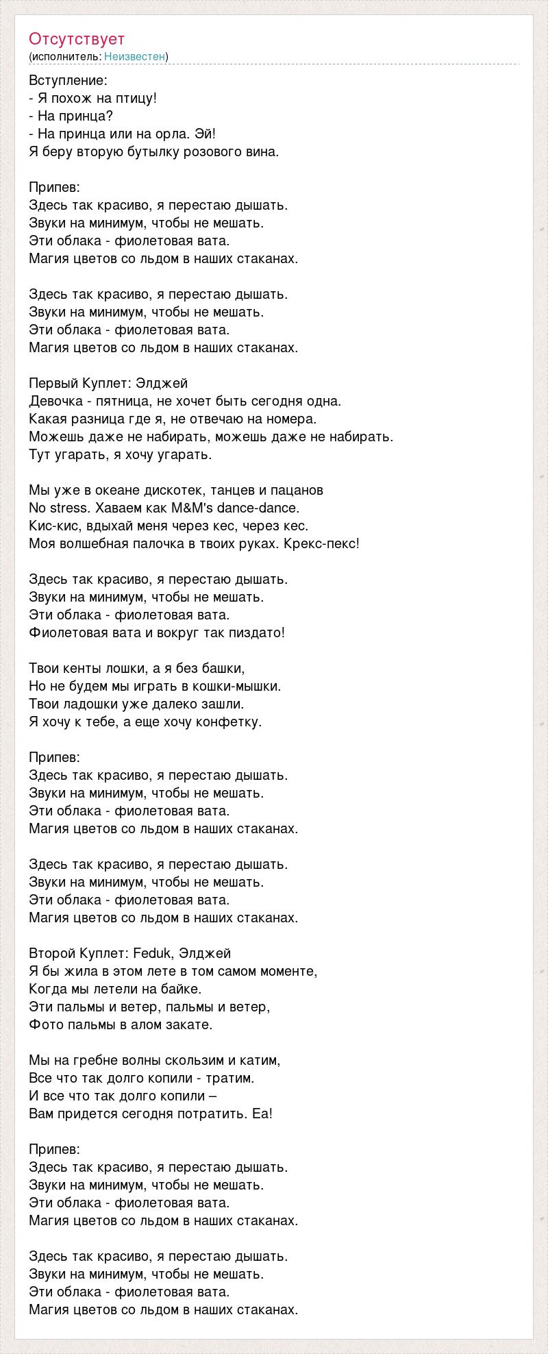 Вступление: - Я похож на птицу! - На принца? - На принца или на орла. Эй! Я беру вторую бутылку розового вина. Припев: Здесь так красиво, я перестаю дышать. Звуки на минимум, чтобы не мешать. Эти облака - фиолетовая вата. Магия цветов со льдом в наших стаканах. Здесь так красиво, я перестаю дышать. Звуки на минимум, чтобы не мешать. Эти облака - фиолетовая вата. Магия цветов со льдом в наших стаканах. Первый Куплет: Элджей Девочка - пятница, не хочет быть сегодня одна. Какая разница где я, не отвечаю на номера. Можешь даже не набирать, можешь даже не набирать. Тут угарать, я хочу угарать. Мы уже в океане дискотек, танцев и пацанов No stress. Хаваем как M&M's dance-dance. Кис-кис, вдыхай меня через кес, через кес. Моя волшебная палочка в твоих руках. Крекс-пекс! Здесь так красиво, я перестаю дышать. Звуки на минимум, чтобы не мешать. Эти облака - фиолетовая вата. Фиолетовая вата и вокруг так пиздато! Твои кенты лошки, а я без башки, Но не будем мы играть в кошки-мышки. Твои ладошки уже далеко зашли. Я хочу к тебе, а еще хочу конфетку. Припев: Здесь так красиво, я перестаю дышать. Звуки на минимум, чтобы не мешать. Эти облака - фиолетовая вата. Магия цветов со льдом в наших стаканах. Здесь так красиво, я перестаю дышать. Звуки на минимум, чтобы не мешать. Эти облака - фиолетовая вата. Магия цветов со льдом в наших стаканах. Второй Куплет: Feduk, Элджей Я бы жила в этом лете в том самом моменте, Когда мы летели на байке. Эти пальмы и ветер, пальмы и ветер, Фото пальмы в алом закате. Мы на гребне волны скользим и катим, Все что так долго копили - тратим. И все что так долго копили – Вам придется сегодня потратить. Еа! Припев: Здесь так красиво, я перестаю дышать. Звуки на минимум, чтобы не мешать. Эти облака - фиолетовая вата. Магия цветов со льдом в наших стаканах. Здесь так красиво, я перестаю дышать. Звуки на минимум, чтобы не мешать. Эти облака - фиолетовая вата. Магия цветов со льдом в наших стаканах.