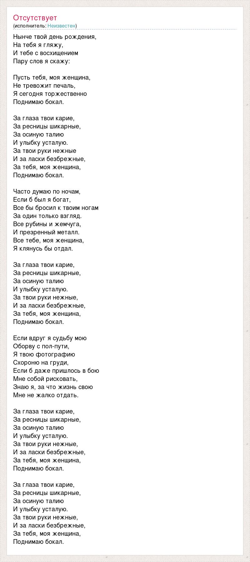 Нынче твой день рождения, На тебя я гляжу, И тебе с восхищением Пару слов я скажу: Пусть тебя, моя женщина, Не тревожит печаль, Я сегодня торжественно Поднимаю бокал. За глаза твои карие, За ресницы шикарные, За осиную талию И улыбку усталую. За твои руки нежные И за ласки безбрежные, За тебя, моя женщина, Поднимаю бокал. Часто думаю по ночам, Если б был я богат, Все бы бросил к твоим ногам За один только взгляд. Все рубины и жемчуга, И презренный металл. Все тебе, моя женщина, Я клянусь бы отдал. За глаза твои карие, За ресницы шикарные, За осиную талию И улыбку усталую. За твои руки нежные, И за ласки безбрежные, За тебя, моя женщина, Поднимаю бокал. Если вдруг я судьбу мою Оборву с пол-пути, Я твою фотографию Схороню на груди, Если б даже пришлось в бою Мне собой рисковать, Знаю я, за что жизнь свою Мне не жалко отдать. За глаза твои карие, За ресницы шикарные, За осиную талию И улыбку усталую. За твои руки нежные, И за ласки безбрежные, За тебя, моя женщина, Поднимаю бокал. За глаза твои карие, За ресницы шикарные, За осиную талию И улыбку усталую. За твои руки нежные, И за ласки безбрежные, За тебя, моя женщина, Поднимаю бокал.