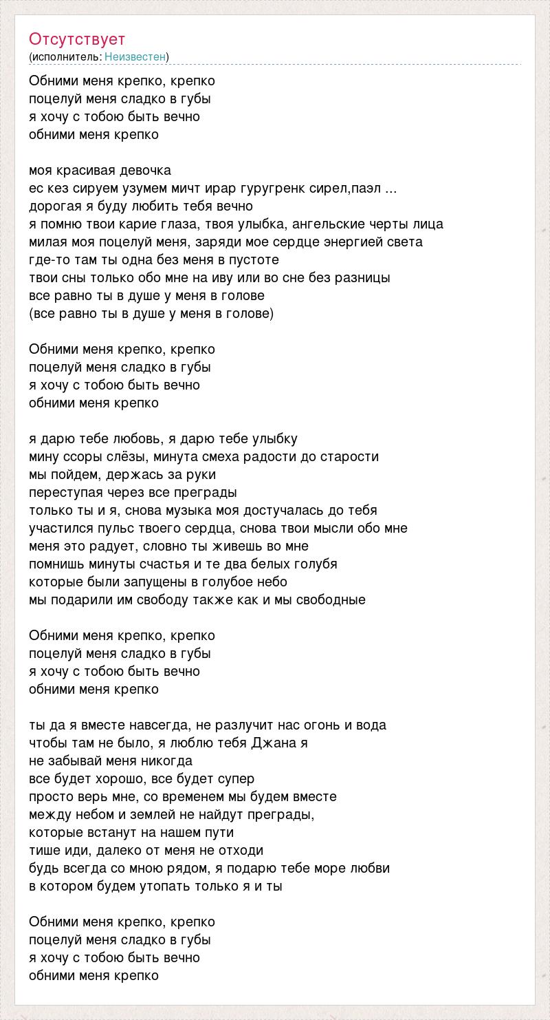 Обними меня крепко, крепко поцелуй меня сладко в губы я хочу с тобою быть вечно обними меня крепко моя красивая девочка ес кез сируем узумем мичт ирар гуругренк сирел,паэл ... дорогая я буду любить тебя вечно я помню твои карие глаза, твоя улыбка, ангельские черты лица милая моя поцелуй меня, заряди мое сердце энергией света где-то там ты одна без меня в пустоте твои сны только обо мне на иву или во сне без разницы все равно ты в душе у меня в голове (все равно ты в душе у меня в голове) Обними меня крепко, крепко поцелуй меня сладко в губы я хочу с тобою быть вечно обними меня крепко я дарю тебе любовь, я дарю тебе улыбку мину ссоры слёзы, минута смеха радости до старости мы пойдем, держась за руки переступая через все преграды только ты и я, снова музыка моя достучалась до тебя участился пульс твоего сердца, снова твои мысли обо мне меня это радует, словно ты живешь во мне помнишь минуты счастья и те два белых голубя которые были запущены в голубое небо мы подарили им свободу также как и мы свободные Обними меня крепко, крепко поцелуй меня сладко в губы я хочу с тобою быть вечно обними меня крепко ты да я вместе навсегда, не разлучит нас огонь и вода чтобы там не было, я люблю тебя Джана я не забывай меня никогда все будет хорошо, все будет супер просто верь мне, со временем мы будем вместе между небом и землей не найдут преграды, которые встанут на нашем пути тише иди, далеко от меня не отходи будь всегда со мною рядом, я подарю тебе море любви в котором будем утопать только я и ты Обними меня крепко, крепко поцелуй меня сладко в губы я хочу с тобою быть вечно обними меня крепко