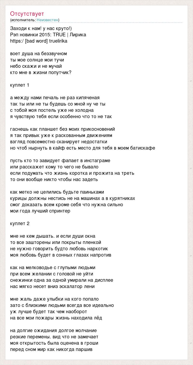 Заходи к нам! у нас круто!) Рэп новинки 2015: TRUE | Лирика https:/ [bad word] truelirika воет душа на беззвучном ты мое солнце мои тучи небо скажи и не мучай кто мне в жизни попутчик? куплет 1 а между нами печаль не раз кипяченая так ты или не ты будешь со мной ну че ты с тобой моя постель уже не холодна я чувствую тебя если особенно что то не так гаснешь как планшет без моих прикосновений я так привык уже к раскованным движениям взгляд повсеместно сканирует недостатки но чтоб нырнуть в кайф есть место для тебя в моем батискафе пусть кто то завидует фапает в инстаграме или расскажет кому то чего не бывало если подумать что жизнь коротка и прожита на треть то они вообще никто чтобы нас задеть как метко не целились будьте паиньками курицы должны нестись не на машинах а в курятниках смог доказать всем кроме себя что нужна сильно мои года лучший спринтер куплет 2 мне не кем дышать. и если души окна то все зашторены или покрыты пленкой не нужно говорить будто любовь наркотик моя любовь будет в сонных глазах напротив как на мелководье с глупыми людьми при всем желании с головой не уйти снежинки одна за одной умирали на дисплее нас мягко несет вниз эскалатор лени мне жаль даже улыбки на кого попало зато с близкими людьми всегда все идеально уж лучше будет так чем наоборот на все мои пожары жизнь находила лёд на долгие ожидания долгое молчание резкие перемены. вид что не замечает моя открытость была оценена в гроши перед сном мир как никогда паршив