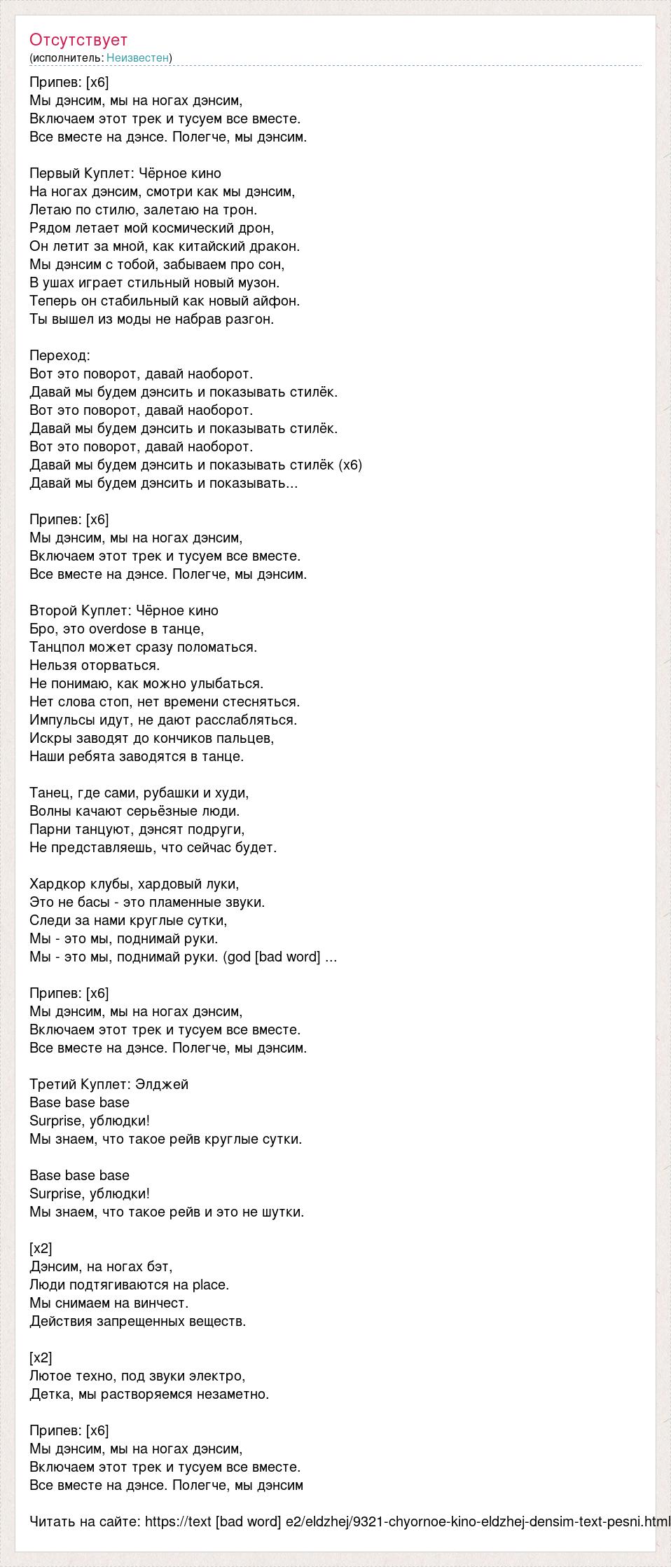 Припев: [x6] Мы дэнсим, мы на ногах дэнсим, Включаем этот трек и тусуем все вместе. Все вместе на дэнсе. Полегче, мы дэнсим. Первый Куплет: Чёрное кино На ногах дэнсим, смотри как мы дэнсим, Летаю по стилю, залетаю на трон. Рядом летает мой космический дрон, Он летит за мной, как китайский дракон. Мы дэнсим с тобой, забываем про сон, В ушах играет стильный новый музон. Теперь он стабильный как новый айфон. Ты вышел из моды не набрав разгон. Переход: Вот это поворот, давай наоборот. Давай мы будем дэнсить и показывать стилёк. Вот это поворот, давай наоборот. Давай мы будем дэнсить и показывать стилёк. Вот это поворот, давай наоборот. Давай мы будем дэнсить и показывать стилёк (х6) Давай мы будем дэнсить и показывать... Припев: [x6] Мы дэнсим, мы на ногах дэнсим, Включаем этот трек и тусуем все вместе. Все вместе на дэнсе. Полегче, мы дэнсим. Второй Куплет: Чёрное кино Бро, это overdose в танце, Танцпол может сразу поломаться. Нельзя оторваться. Не понимаю, как можно улыбаться. Нет слова стоп, нет времени стесняться. Импульсы идут, не дают расслабляться. Искры заводят до кончиков пальцев, Наши ребята заводятся в танце. Танец, где сами, рубашки и худи, Волны качают серьёзные люди. Парни танцуют, дэнсят подруги, Не представляешь, что сейчас будет. Хардкор клубы, хардовый луки, Это не басы - это пламенные звуки. Следи за нами круглые сутки, Мы - это мы, поднимай руки. Мы - это мы, поднимай руки. (god [bad word] ... Припев: [x6] Мы дэнсим, мы на ногах дэнсим, Включаем этот трек и тусуем все вместе. Все вместе на дэнсе. Полегче, мы дэнсим. Третий Куплет: Элджей Base base base Surprise, ублюдки! Мы знаем, что такое рейв круглые сутки. Base base base Surprise, ублюдки! Мы знаем, что такое рейв и это не шутки. [x2] Дэнсим, на ногах бэт, Люди подтягиваются на place. Мы снимаем на винчест. Действия запрещенных веществ. [x2] Лютое техно, под звуки электро, Детка, мы растворяемся незаметно. Припев: [x6] Мы дэнсим, мы на ногах дэнсим, Включаем этот трек и тусуем все вместе. Все вместе на дэнсе. Полегче, мы дэнсим Читать на сайте: https://text [bad word] e2/eldzhej/9321-chyornoe-kino-eldzhej-densim-text-pesni.html