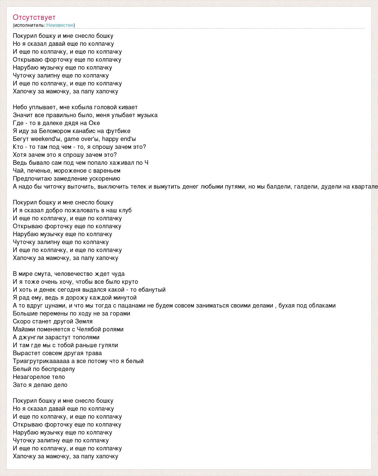 Покурил бошку и мне снесло бошку Но я сказал давай еще по колпачку И еще по колпачку, и еще по колпачку Открываю форточку еще по колпачку Нарубаю музычку еще по колпачку Чуточку залипну еще по колпачку И еще по колпачку, и еще по колпачку Хапочку за мамочку, за папу хапочку Небо уплывает, мне кобыла головой кивает Значит все правильно было, меня улыбает музыка Где - то в далеке дядя на Оке Я иду за Беломором канабис на футбике Бегут weekend'ы, game over'ы, happy end'ы Кто - то там под чем - то, я спрошу зачем это? Хотя зачем это я спрошу зачем это? Ведь бывало сам под чем попало хаживал по Ч Чай, печенье, мороженое с вареньем Предпочитаю замедление ускорению А надо бы читочку выточить, выключить телек и вымутить денег любыми путями, но мы балдели, галдели, дудели на квартале Покурил бошку и мне снесло бошку И я сказал добро пожаловать в наш клуб И еще по колпачку, и еще по колпачку Открываю форточку еще по колпачку Нарубаю музычку еще по колпачку Чуточку залипну еще по колпачку И еще по колпачку, и еще по колпачку Хапочку за мамочку, за папу хапочку В мире смута, человечество ждет чуда И я тоже очень хочу, чтобы все было круто И хоть и денек сегодня выдался какой - то ебанутый Я рад ему, ведь я дорожу каждой минутой А то вдруг цунами, и что мы тогда с пацанами не будем совсем заниматься своими делами , бухая под облаками Большие перемены по ходу не за горами Скоро станет другой Земля Майами поменяется с Челябой ролями А джунгли зарастут тополями И там где мы с тобой раньше гуляли Вырастет совсем другая трава Триагрутрикаааааа а все потому что я белый Белый по беспределу Незагорелое тело Зато я делаю дело Покурил бошку и мне снесло бошку Но я сказал давай еще по колпачку И еще по колпачку, и еще по колпачку Открываю форточку еще по колпачку Нарубаю музычку еще по колпачку Чуточку залипну еще по колпачку И еще по колпачку, и еще по колпачку Хапочку за мамочку, за папу хапочку