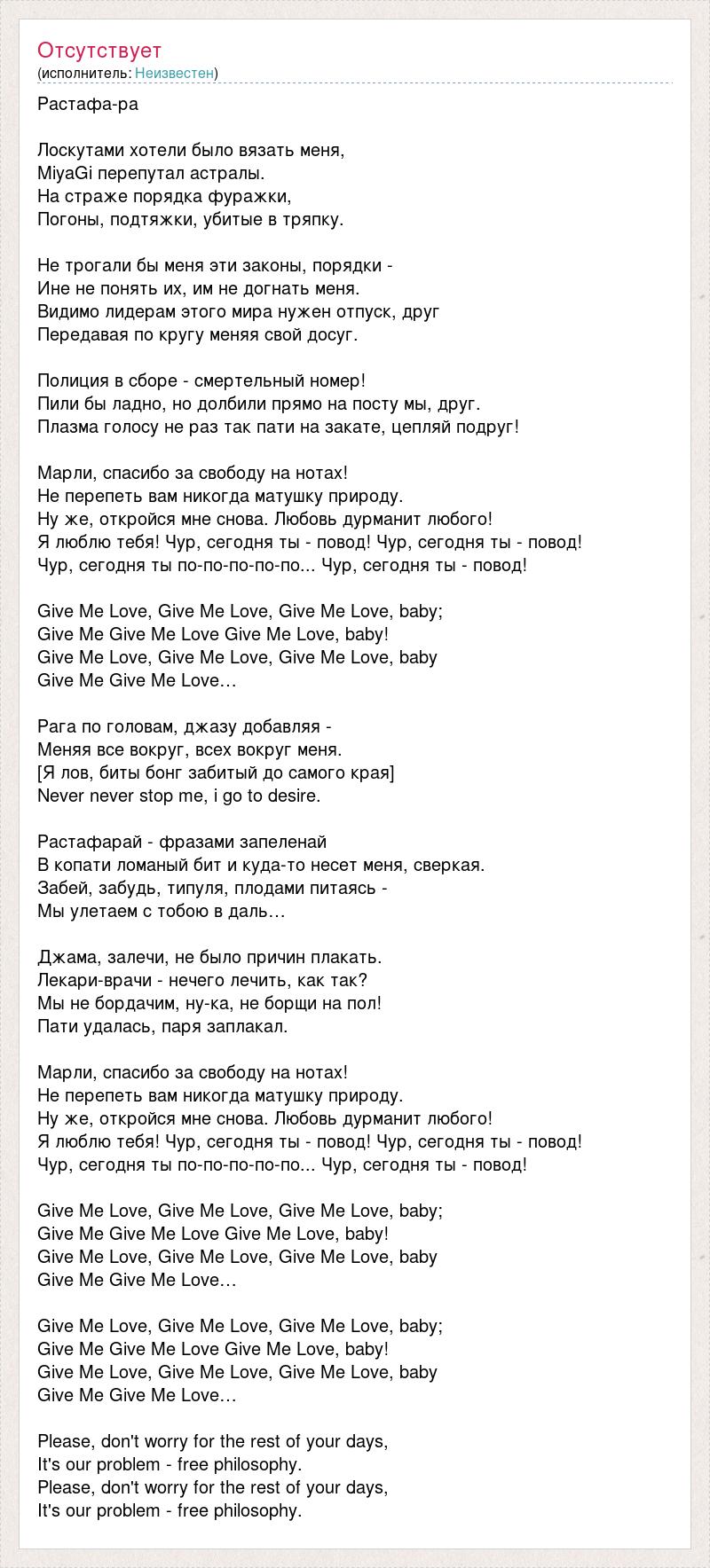 Растафа-ра Лоскутами хотели было вязать меня, MiyaGi перепутал астралы. На страже порядка фуражки, Погоны, подтяжки, убитые в тряпку. Не трогали бы меня эти законы, порядки - Ине не понять их, им не догнать меня. Видимо лидерам этого мира нужен отпуск, друг Передавая по кругу меняя свой досуг. Полиция в сборе - смертельный номер! Пили бы ладно, но долбили прямо на посту мы, друг. Плазма голосу не раз так пати на закате, цепляй подруг! Марли, спасибо за свободу на нотах! Не перепеть вам никогда матушку природу. Ну же, откройся мне снова. Любовь дурманит любого! Я люблю тебя! Чур, сегодня ты - повод! Чур, сегодня ты - повод! Чур, сегодня ты по-по-по-по-по... Чур, сегодня ты - повод! Give Me Love, Give Me Love, Give Me Love, baby; Give Me Give Me Love Give Me Love, baby! Give Me Love, Give Me Love, Give Me Love, baby Give Me Give Me Love… Рага по головам, джазу добавляя - Меняя все вокруг, всех вокруг меня. [Я лов, биты бонг забитый до самого края] Never never stop me, i go to desire. Растафарай - фразами запеленай В копати ломаный бит и куда-то несет меня, сверкая. Забей, забудь, типуля, плодами питаясь - Мы улетаем с тобою в даль… Джама, залечи, не было причин плакать. Лекари-врачи - нечего лечить, как так? Мы не бордачим, ну-ка, не борщи на пол! Пати удалась, паря заплакал. Марли, спасибо за свободу на нотах! Не перепеть вам никогда матушку природу. Ну же, откройся мне снова. Любовь дурманит любого! Я люблю тебя! Чур, сегодня ты - повод! Чур, сегодня ты - повод! Чур, сегодня ты по-по-по-по-по... Чур, сегодня ты - повод! Give Me Love, Give Me Love, Give Me Love, baby; Give Me Give Me Love Give Me Love, baby! Give Me Love, Give Me Love, Give Me Love, baby Give Me Give Me Love… Give Me Love, Give Me Love, Give Me Love, baby; Give Me Give Me Love Give Me Love, baby! Give Me Love, Give Me Love, Give Me Love, baby Give Me Give Me Love… Please, don't worry for the rest of your days, It's our problem - free philosophy. Please, don't worry for the rest of your days, It's our problem - free philosophy.