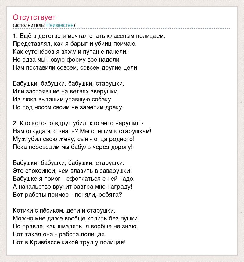 1. Ещё в детстве я мечтал стать классным полицаем, Представлял, как я барыг и убийц поймаю. Как сутенёров я вяжу и путан с панели. Но едва мы новую форму все надели, Нам поставили совсем, совсем другие цели: Бабушки, бабушки, бабушки, старушки, Или застрявшие на ветвях зверушки. Из люка вытащим упавшую собаку. Но под носом своим не заметим драку. 2. Кто кого-то вдруг убил, кто чего нарушил - Нам откуда это знать? Мы спешим к старушкам! Муж убил свою жену, сын - отца родного! Пока переводим мы бабуль через дорогу! Бабушки, бабушки, бабушки, старушки. Это спокойней, чем влазить в заварушки! Бабушке я помог - сфоткаться с ней надо. А начальство вручит завтра мне награду! Вот работы пример - поняли, ребята? Котики с пёсиком, дети и старушки, Можно мне даже вообще ходить без пушки. По правде, как шмалять, я вообще не знаю. Вот такая она - работа полицая. Вот в Кривбассе какой труд у полицая!