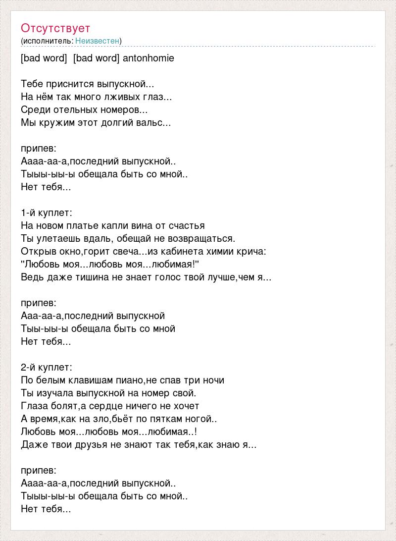 [bad word] [bad word] antonhomie Тебе приснится выпускной... На нём так много лживых глаз... Среди отельных номеров... Мы кружим этот долгий вальс... припев: Аааа-аа-а,последний выпускной.. Тыыы-ыы-ы обещала быть со мной.. Нет тебя... 1-й куплет: На новом платье капли вина от счастья Ты улетаешь вдаль, обещай не возвращаться. Открыв окно,горит свеча...из кабинета химии крича: ''Любовь моя...любовь моя...любимая!'' Ведь даже тишина не знает голос твой лучше,чем я... припев: Ааа-аа-а,последний выпускной Тыы-ыы-ы обещала быть со мной Нет тебя... 2-й куплет: По белым клавишам пиано,не спав три ночи Ты изучала выпускной на номер свой. Глаза болят,а сердце ничего не хочет А время,как на зло,бьёт по пяткам ногой.. Любовь моя...любовь моя...любимая..! Даже твои друзья не знают так тебя,как знаю я... припев: Аааа-аа-а,последний выпускной.. Тыыы-ыы-ы обещала быть со мной.. Нет тебя...