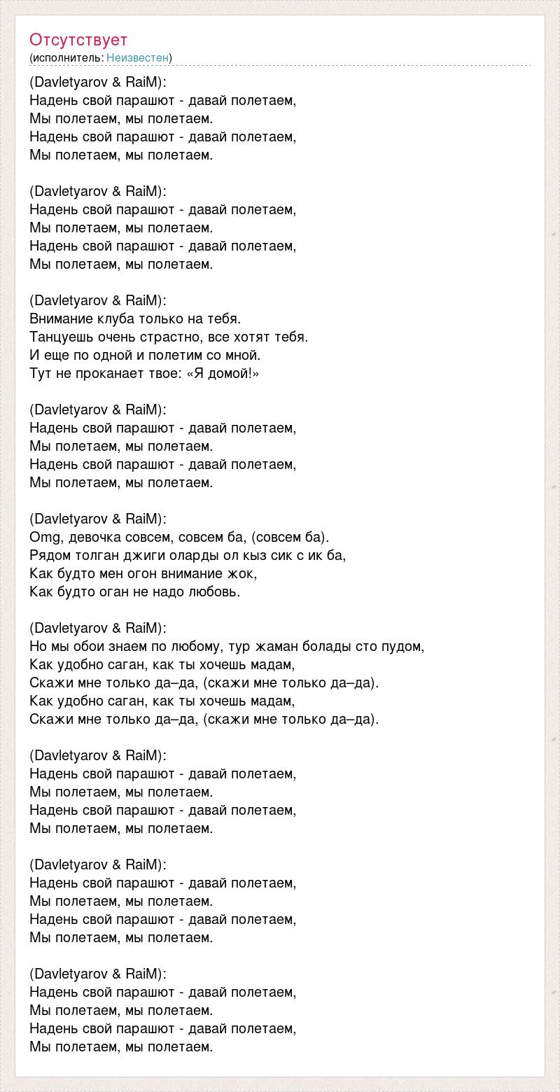 (Davletyarov & RaiM): Надень свой парашют - давай полетаем, Мы полетаем, мы полетаем. Надень свой парашют - давай полетаем, Мы полетаем, мы полетаем. (Davletyarov & RaiM): Надень свой парашют - давай полетаем, Мы полетаем, мы полетаем. Надень свой парашют - давай полетаем, Мы полетаем, мы полетаем. (Davletyarov & RaiM): Внимание клуба только на тебя. Танцуешь очень страстно, все хотят тебя. И еще по одной и полетим со мной. Тут не проканает твое: «Я домой!» (Davletyarov & RaiM): Надень свой парашют - давай полетаем, Мы полетаем, мы полетаем. Надень свой парашют - давай полетаем, Мы полетаем, мы полетаем. (Davletyarov & RaiM): Оmg, девочка совсем, совсем ба, (совсем ба). Рядом толган джиги оларды ол кыз сик с ик ба, Как будто мен огон внимание жок, Как будто оган не надо любовь. (Davletyarov & RaiM): Но мы обои знаем по любому, тур жаман болады сто пудом, Как удобно саган, как ты хочешь мадам, Скажи мне только да–да, (скажи мне только да–да). Как удобно саган, как ты хочешь мадам, Скажи мне только да–да, (скажи мне только да–да). (Davletyarov & RaiM): Надень свой парашют - давай полетаем, Мы полетаем, мы полетаем. Надень свой парашют - давай полетаем, Мы полетаем, мы полетаем. (Davletyarov & RaiM): Надень свой парашют - давай полетаем, Мы полетаем, мы полетаем. Надень свой парашют - давай полетаем, Мы полетаем, мы полетаем. (Davletyarov & RaiM): Надень свой парашют - давай полетаем, Мы полетаем, мы полетаем. Надень свой парашют - давай полетаем, Мы полетаем, мы полетаем.