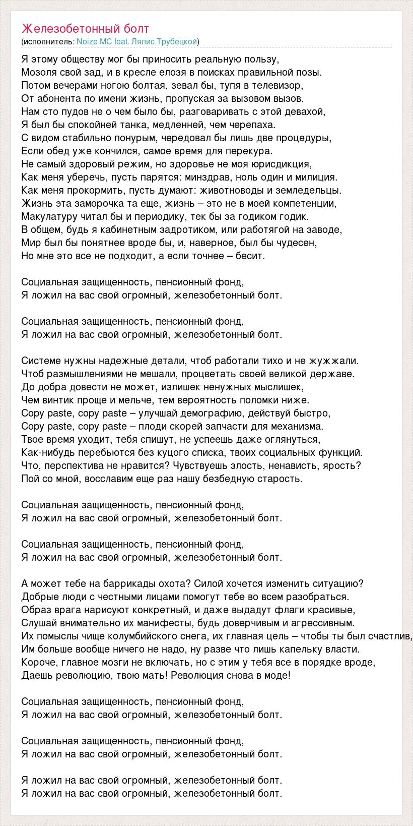 Я этому обществу мог бы приносить реальную пользу, Мозоля свой зад, и в кресле елозя в поисках правильной позы. Потом вечерами ногою болтая, зевал бы, тупя в телевизор, От абонента по имени жизнь, пропуская за вызовом вызов. Нам сто пудов не о чем было бы, разговаривать с этой девахой, Я был бы спокойней танка, медленней, чем черепаха. С видом стабильно понурым, чередовал бы лишь две процедуры, Если обед уже кончился, самое время для перекура. Не самый здоровый режим, но здоровье не моя юрисдикция, Как меня уберечь, пусть парятся: минздрав, ноль один и милиция. Как меня прокормить, пусть думают: животноводы и земледельцы. Жизнь эта заморочка та еще, жизнь – это не в моей компетенции, Макулатуру читал бы и периодику, тек бы за годиком годик. В общем, будь я кабинетным задротиком, или работягой на заводе, Мир был бы понятнее вроде бы, и, наверное, был бы чудесен, Но мне это все не подходит, а если точнее – бесит. Социальная защищенность, пенсионный фонд, Я ложил на вас свой огромный, железобетонный болт. Социальная защищенность, пенсионный фонд, Я ложил на вас свой огромный, железобетонный болт. Системе нужны надежные детали, чтоб работали тихо и не жужжали. Чтоб размышлениями не мешали, процветать своей великой державе. До добра довести не может, излишек ненужных мыслишек, Чем винтик проще и мельче, тем вероятность поломки ниже. Copy paste, copy paste – улучшай демографию, действуй быстро, Copy paste, copy paste – плоди скорей запчасти для механизма. Твое время уходит, тебя спишут, не успеешь даже оглянуться, Как-нибудь перебьются без куцого списка, твоих социальных функций. Что, перспектива не нравится? Чувствуешь злость, ненависть, ярость? Пой со мной, восславим еще раз нашу безбедную старость. Социальная защищенность, пенсионный фонд, Я ложил на вас свой огромный, железобетонный болт. Социальная защищенность, пенсионный фонд, Я ложил на вас свой огромный, железобетонный болт. А может тебе на баррикады охота? Силой хочется изменить ситуацию? Добрые люди с честными лицами помогут тебе во всем разобраться. Образ врага нарисуют конкретный, и даже выдадут флаги красивые, Слушай внимательно их манифесты, будь доверчивым и агрессивным. Их помыслы чище колумбийского снега, их главная цель – чтобы ты был счастлив, Им больше вообще ничего не надо, ну разве что лишь капельку власти. Короче, главное мозги не включать, но с этим у тебя все в порядке вроде, Даешь революцию, твою мать! Революция снова в моде! Социальная защищенность, пенсионный фонд, Я ложил на вас свой огромный, железобетонный болт. Социальная защищенность, пенсионный фонд, Я ложил на вас свой огромный, железобетонный болт. Я ложил на вас свой огромный, железобетонный болт. Я ложил на вас свой огромный, железобетонный болт.