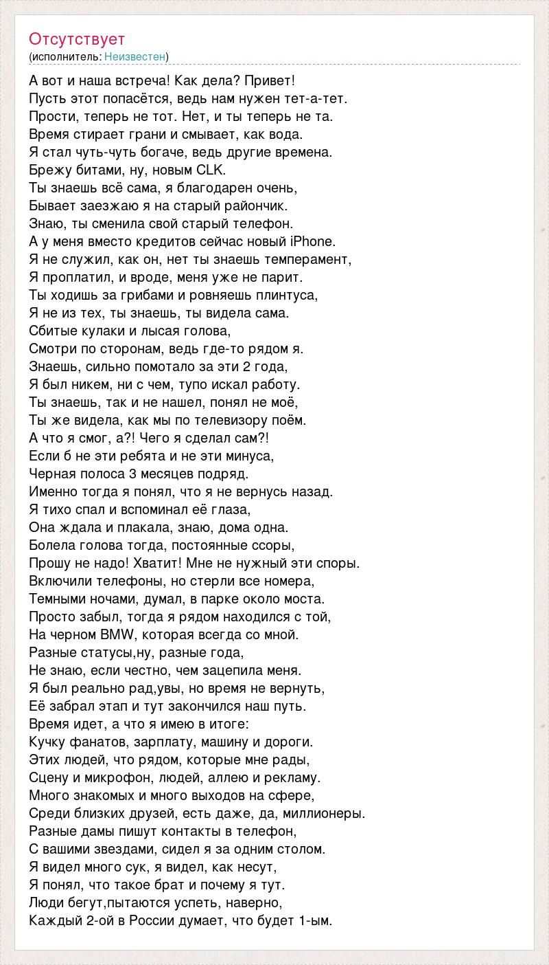 А вот и наша встреча! Как дела? Привет! Пусть этот попасётся, ведь нам нужен тет-а-тет. Прости, теперь не тот. Нет, и ты теперь не та. Время стирает грани и смывает, как вода. Я стал чуть-чуть богаче, ведь другие времена. Брежу битами, ну, новым CLK. Ты знаешь всё сама, я благодарен очень, Бывает заезжаю я на старый райончик. Знаю, ты сменила свой старый телефон. А у меня вместо кредитов сейчас новый iPhone. Я не служил, как он, нет ты знаешь темперамент, Я проплатил, и вроде, меня уже не парит. Ты ходишь за грибами и ровняешь плинтуса, Я не из тех, ты знаешь, ты видела сама. Сбитые кулаки и лысая голова, Смотри по сторонам, ведь где-то рядом я. Знаешь, сильно помотало за эти 2 года, Я был никем, ни с чем, тупо искал работу. Ты знаешь, так и не нашел, понял не моё, Ты же видела, как мы по телевизору поём. А что я смог, а?! Чего я сделал сам?! Если б не эти ребята и не эти минуса, Черная полоса 3 месяцев подряд. Именно тогда я понял, что я не вернусь назад. Я тихо спал и вспоминал её глаза, Она ждала и плакала, знаю, дома одна. Болела голова тогда, постоянные ссоры, Прошу не надо! Хватит! Мне не нужный эти споры. Включили телефоны, но стерли все номера, Темными ночами, думал, в парке около моста. Просто забыл, тогда я рядом находился с той, На черном BMW, которая всегда со мной. Разные статусы,ну, разные года, Не знаю, если честно, чем зацепила меня. Я был реально рад,увы, но время не вернуть, Её забрал этап и тут закончился наш путь. Время идет, а что я имею в итоге: Кучку фанатов, зарплату, машину и дороги. Этих людей, что рядом, которые мне рады, Сцену и микрофон, людей, аллею и рекламу. Много знакомых и много выходов на сфере, Среди близких друзей, есть даже, да, миллионеры. Разные дамы пишут контакты в телефон, С вашими звездами, сидел я за одним столом. Я видел много сук, я видел, как несут, Я понял, что такое брат и почему я тут. Люди бегут,пытаются успеть, наверно, Каждый 2-ой в России думает, что будет 1-ым.