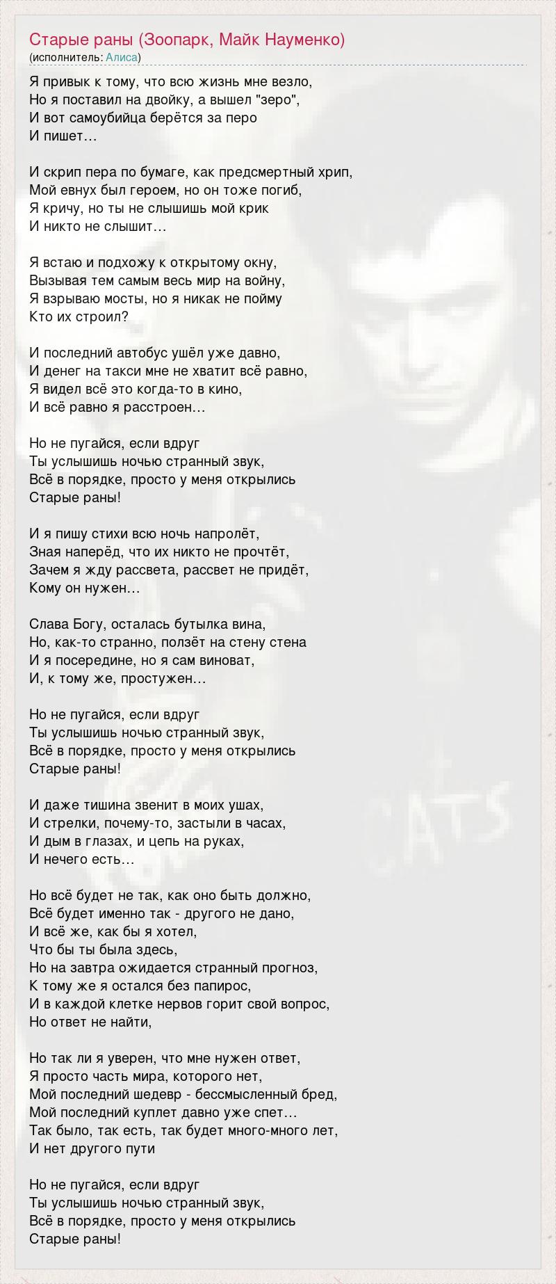 Я привык к тому, что всю жизнь мне везло, Но я поставил на двойку, а вышел "зеро", И вот самоубийца берётся за перо И пишет… И скрип пера по бумаге, как предсмертный хрип, Мой евнух был героем, но он тоже погиб, Я кричу, но ты не слышишь мой крик И никто не слышит… Я встаю и подхожу к открытому окну, Вызывая тем самым весь мир на войну, Я взрываю мосты, но я никак не пойму Кто их строил? И последний автобус ушёл уже давно, И денег на такси мне не хватит всё равно, Я видел всё это когда-то в кино, И всё равно я расстроен… Но не пугайся, если вдруг Ты услышишь ночью странный звук, Всё в порядке, просто у меня открылись Старые раны! И я пишу стихи всю ночь напролёт, Зная наперёд, что их никто не прочтёт, Зачем я жду рассвета, рассвет не придёт, Кому он нужен… Слава Богу, осталась бутылка вина, Но, как-то странно, ползёт на стену стена И я посередине, но я сам виноват, И, к тому же, простужен… Но не пугайся, если вдруг Ты услышишь ночью странный звук, Всё в порядке, просто у меня открылись Старые раны! И даже тишина звенит в моих ушах, И стрелки, почему-то, застыли в часах, И дым в глазах, и цепь на руках, И нечего есть… Но всё будет не так, как оно быть должно, Всё будет именно так - другого не дано, И всё же, как бы я хотел, Что бы ты была здесь, Но на завтра ожидается странный прогноз, К тому же я остался без папирос, И в каждой клетке нервов горит свой вопрос, Но ответ не найти, Но так ли я уверен, что мне нужен ответ, Я просто часть мира, которого нет, Мой последний шедевр - бессмысленный бред, Мой последний куплет давно уже спет… Так было, так есть, так будет много-много лет, И нет другого пути Но не пугайся, если вдруг Ты услышишь ночью странный звук, Всё в порядке, просто у меня открылись Старые раны!