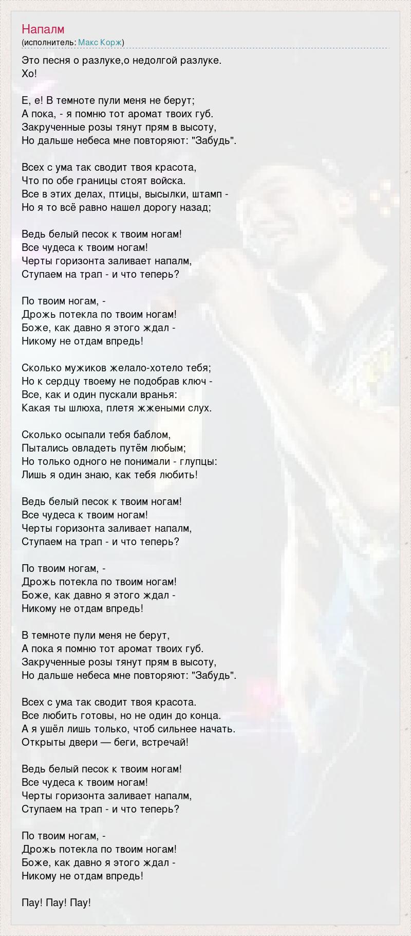 Это песня о разлуке,о недолгой разлуке. Хо! Е, е! В темноте пули меня не берут; А пока, - я помню тот аромат твоих губ. Закрученные розы тянут прям в высоту, Но дальше небеса мне повторяют: "Забудь". Всех с ума так сводит твоя красота, Что по обе границы стоят войска. Все в этих делах, птицы, высылки, штамп - Но я то всё равно нашел дорогу назад; Ведь белый песок к твоим ногам! Все чудеса к твоим ногам! Черты горизонта заливает напалм, Ступаем на трап - и что теперь? По твоим ногам, - Дрожь потекла по твоим ногам! Боже, как давно я этого ждал - Никому не отдам впредь! Сколько мужиков желало-хотело тебя; Но к сердцу твоему не подобрав ключ - Все, как и один пускали вранья: Какая ты шлюха, плетя жжеными слух. Сколько осыпали тебя баблом, Пытались овладеть путём любым; Но только одного не понимали - глупцы: Лишь я один знаю, как тебя любить! Ведь белый песок к твоим ногам! Все чудеса к твоим ногам! Черты горизонта заливает напалм, Ступаем на трап - и что теперь? По твоим ногам, - Дрожь потекла по твоим ногам! Боже, как давно я этого ждал - Никому не отдам впредь! В темноте пули меня не берут, А пока я помню тот аромат твоих губ. Закрученные розы тянут прям в высоту, Но дальше небеса мне повторяют: "Забудь". Всех с ума так сводит твоя красота. Все любить готовы, но не один до конца. А я ушёл лишь только, чтоб сильнее начать. Открыты двери — беги, встречай! Ведь белый песок к твоим ногам! Все чудеса к твоим ногам! Черты горизонта заливает напалм, Ступаем на трап - и что теперь? По твоим ногам, - Дрожь потекла по твоим ногам! Боже, как давно я этого ждал - Никому не отдам впредь! Пау! Пау! Пау!