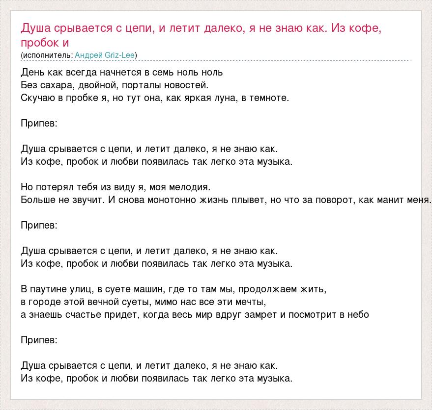День как всегда начнется в семь ноль ноль Без сахара, двойной, порталы новостей. Скучаю в пробке я, но тут она, как яркая луна, в темноте. Припев: Душа срывается с цепи, и летит далеко, я не знаю как. Из кофе, пробок и любви появилась так легко эта музыка. Но потерял тебя из виду я, моя мелодия. Больше не звучит. И снова монотонно жизнь плывет, но что за поворот, как манит меня. Припев: Душа срывается с цепи, и летит далеко, я не знаю как. Из кофе, пробок и любви появилась так легко эта музыка. В паутине улиц, в суете машин, где то там мы, продолжаем жить, в городе этой вечной суеты, мимо нас все эти мечты, а знаешь счастье придет, когда весь мир вдруг замрет и посмотрит в небо Припев: Душа срывается с цепи, и летит далеко, я не знаю как. Из кофе, пробок и любви появилась так легко эта музыка.