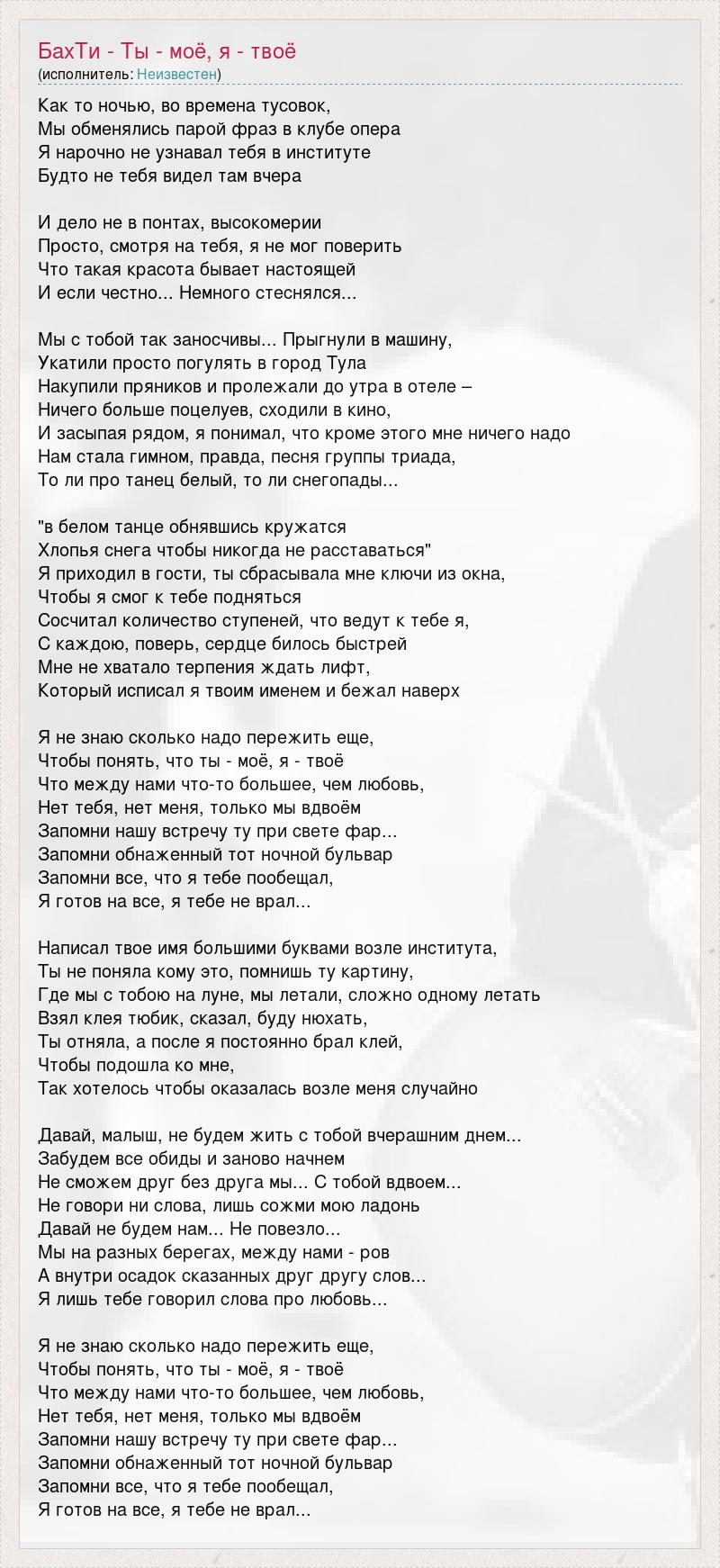 Как то ночью, во времена тусовок, Мы обменялись парой фраз в клубе опера Я нарочно не узнавал тебя в институте Будто не тебя видел там вчера И дело не в понтах, высокомерии Просто, смотря на тебя, я не мог поверить Что такая красота бывает настоящей И если честно... Немного стеснялся... Мы с тобой так заносчивы... Прыгнули в машину, Укатили просто погулять в город Тула Накупили пряников и пролежали до утра в отеле – Ничего больше поцелуев, сходили в кино, И засыпая рядом, я понимал, что кроме этого мне ничего надо Нам стала гимном, правда, песня группы триада, То ли про танец белый, то ли снегопады... "в белом танце обнявшись кружатся Хлопья снега чтобы никогда не расставаться" Я приходил в гости, ты сбрасывала мне ключи из окна, Чтобы я смог к тебе подняться Сосчитал количество ступеней, что ведут к тебе я, С каждою, поверь, сердце билось быстрей Мне не хватало терпения ждать лифт, Который исписал я твоим именем и бежал наверх Я не знаю сколько надо пережить еще, Чтобы понять, что ты - моё, я - твоё Что между нами что-то большее, чем любовь, Нет тебя, нет меня, только мы вдвоём Запомни нашу встречу ту при свете фар... Запомни обнаженный тот ночной бульвар Запомни все, что я тебе пообещал, Я готов на все, я тебе не врал... Написал твое имя большими буквами возле института, Ты не поняла кому это, помнишь ту картину, Где мы с тобою на луне, мы летали, сложно одному летать Взял клея тюбик, сказал, буду нюхать, Ты отняла, а после я постоянно брал клей, Чтобы подошла ко мне, Так хотелось чтобы оказалась возле меня случайно Давай, малыш, не будем жить с тобой вчерашним днем... Забудем все обиды и заново начнем Не сможем друг без друга мы... С тобой вдвоем... Не говори ни слова, лишь сожми мою ладонь Давай не будем нам... Не повезло... Мы на разных берегах, между нами - ров А внутри осадок сказанных друг другу слов... Я лишь тебе говорил слова про любовь... Я не знаю сколько надо пережить еще, Чтобы понять, что ты - моё, я - твоё Что между нами что-то большее, чем любовь, Нет тебя, нет меня, только мы вдвоём Запомни нашу встречу ту при свете фар... Запомни обнаженный тот ночной бульвар Запомни все, что я тебе пообещал, Я готов на все, я тебе не врал...