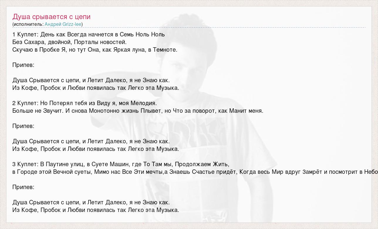 1 Куплет: День как Всегда начнется в Семь Ноль Ноль Без Сахара, двойной, Порталы новостей. Скучаю в Пробке Я, но тут Она, как Яркая луна, в Темноте. Припев: Душа Срывается с цепи, и Летит Далеко, я не Знаю как. Из Кофе, Пробок и Любви появилась так Легко эта Музыка. 2 Куплет: Но Потерял тебя из Виду я, моя Мелодия. Больше не Звучит. И снова Монотонно жизнь Плывет, но Что за поворот, как Манит меня. Припев: Душа Срывается с цепи, и Летит Далеко, я не Знаю как. Из Кофе, Пробок и Любви появилась так Легко эта Музыка. 3 Куплет: В Паутине улиц, в Суете Машин, где То Там мы, Продолжаем Жить, в Городе этой Вечной суеты, Мимо нас Все Эти мечты,а Знаешь Счастье придёт, Когда весь Мир вдруг 3амрёт и посмотрит в Небо Припев: Душа Срывается с цепи, и Летит Далеко, я не Знаю как. Из Кофе, Пробок и Любви появилась так Легко эта Музыка.
