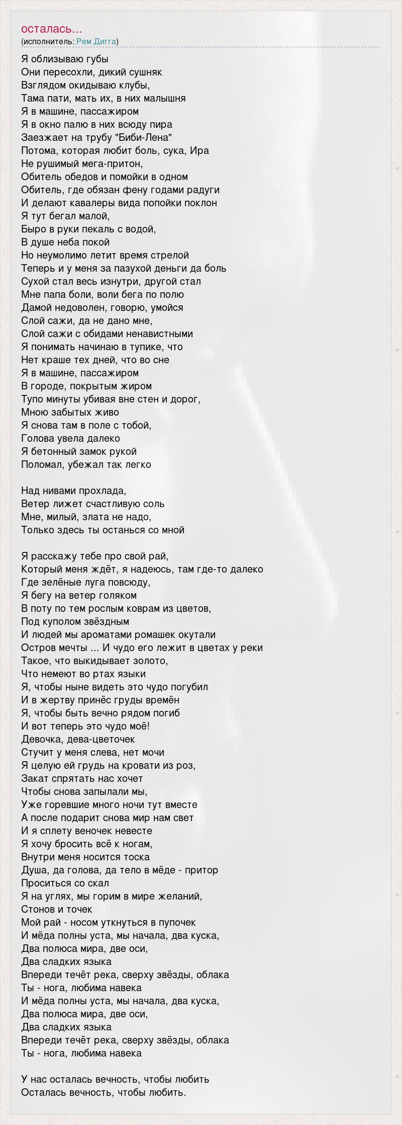 Я облизываю губы Они пересохли, дикий сушняк Взглядом окидываю клубы, Тама пати, мать их, в них малышня Я в машине, пассажиром Я в окно палю в них всюду пира Заезжает на трубу "Биби-Лена" Потома, которая любит боль, сука, Ира Не рушимый мега-притон, Обитель обедов и помойки в одном Обитель, где обязан фену годами радуги И делают кавалеры вида попойки поклон Я тут бегал малой, Быро в руки пекаль с водой, В душе неба покой Но неумолимо летит время стрелой Теперь и у меня за пазухой деньги да боль Сухой стал весь изнутри, другой стал Мне папа боли, воли бега по полю Дамой недоволен, говорю, умойся Слой сажи, да не дано мне, Слой сажи с обидами ненавистными Я понимать начинаю в тупике, что Нет краше тех дней, что во сне Я в машине, пассажиром В городе, покрытым жиром Тупо минуты убивая вне стен и дорог, Мною забытых живо Я снова там в поле с тобой, Голова увела далеко Я бетонный замок рукой Поломал, убежал так легко Над нивами прохлада, Ветер лижет счастливую соль Мне, милый, злата не надо, Только здесь ты останься со мной Я расскажу тебе про свой рай, Который меня ждёт, я надеюсь, там где-то далеко Где зелёные луга повсюду, Я бегу на ветер голяком В поту по тем рослым коврам из цветов, Под куполом звёздным И людей мы ароматами ромашек окутали Остров мечты ... И чудо его лежит в цветах у реки Такое, что выкидывает золото, Что немеют во ртах языки Я, чтобы ныне видеть это чудо погубил И в жертву принёс груды времён Я, чтобы быть вечно рядом погиб И вот теперь это чудо моё! Девочка, дева-цветочек Стучит у меня слева, нет мочи Я целую ей грудь на кровати из роз, Закат спрятать нас хочет Чтобы снова запылали мы, Уже горевшие много ночи тут вместе А после подарит снова мир нам свет И я сплету веночек невесте Я хочу бросить всё к ногам, Внутри меня носится тоска Душа, да голова, да тело в мёде - притор Проситься со скал Я на углях, мы горим в мире желаний, Стонов и точек Мой рай - носом уткнуться в пупочек И мёда полны уста, мы начала, два куска, Два полюса мира, две оси, Два сладких языка Впереди течёт река, сверху звёзды, облака Ты - нога, любима навека И мёда полны уста, мы начала, два куска, Два полюса мира, две оси, Два сладких языка Впереди течёт река, сверху звёзды, облака Ты - нога, любима навека У нас осталась вечность, чтобы любить Осталась вечность, чтобы любить.