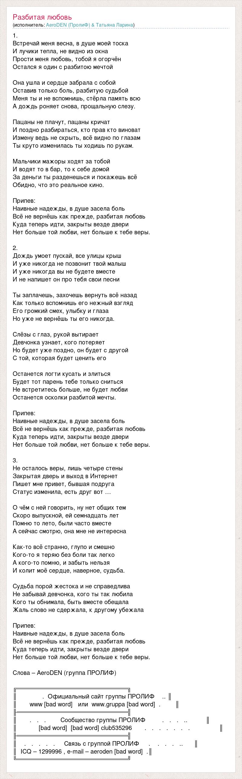 1. Встречай меня весна, в душе моей тоска И лучики тепла, не видно из окна Прости меня любовь, тобой я огорчён Остался я один с разбитою мечтой Она ушла и сердце забрала с собой Оставив только боль, разбитую судьбой Меня ты и не вспомнишь, стёрла память всю А дождь роняет снова, прощальную слезу. Пацаны не плачут, пацаны кричат И поздно разбираться, кто прав кто виноват Измену ведь не скрыть, всё видно по глазам Ты круто изменилась ты ходишь по рукам. Мальчики мажоры ходят за тобой И водят то в бар, то к себе домой За деньги ты разденешься и покажешь всё Обидно, что это реальное кино. Припев: Наивные надежды, в душе засела боль Всё не вернёшь как прежде, разбитая любовь Куда теперь идти, закрыты везде двери Нет больше той любви, нет больше к тебе веры. 2. Дождь умоет пускай, все улицы крыш И уже никогда не позвонит твой малыш И уже никогда вы не будете вместе И не напишет он про тебя свои песни Ты заплачешь, захочешь вернуть всё назад Как только вспомнишь его нежный взгляд Его громкий смех, улыбку и глаза Но уже не вернёшь ты его никогда. Слёзы с глаз, рукой вытирает Девчонка узнает, кого потеряет Но будет уже поздно, он будет с другой С той, которая будет ценить его Останется логти кусать и злиться Будет тот парень тебе только сниться Не встретитесь больше, не будет любви Останется осколки разбитой мечты. Припев: Наивные надежды, в душе засела боль Всё не вернёшь как прежде, разбитая любовь Куда теперь идти, закрыты везде двери Нет больше той любви, нет больше к тебе веры. 3. Не осталось веры, лишь четыре стены Закрытая дверь и выход в Интернет Пишет мне привет, бывшая подруга Статус изменила, есть друг вот … О чём с ней говорить, ну нет общих тем Скоро выпускной, ей семнадцать лет Помню то лето, были часто вместе А сейчас смотрю, она мне не интересна Как-то всё странно, глупо и смешно Кого-то я теряю без боли так легко А кого-то помню, и забыть нельзя И колит моё сердце, наверное, судьба. Судьба порой жестока и не справедлива Не забывай девчонка, кого ты так любила Кого ты обнимала, быть вместе обещала Жаль слово не сдержала, к другому убежала Припев: Наивные надежды, в душе засела боль Всё не вернёшь как прежде, разбитая любовь Куда теперь идти, закрыты везде двери Нет больше той любви, нет больше к тебе веры. Слова – AeroDEN (группа ПРОЛИФ) ╔══════════════════════════╗ ║ . Официальный сайт группы ПРОЛИФ .. ║ ║ www [bad word] или www.gruppa [bad word] . ║ ╟══════════════════════════╣ ║ . . . Сообщество группы ПРОЛИФ . . . .. ║ ║ [bad word] [bad word] club535296 . . . . . . . ║ ╟══════════════════════════╣ ║ . . . . . Связь с группой ПРОЛИФ . . . . .. ║ ║ ICQ – 1299996 , e-mail – aeroden [bad word] .║ ╚══════════════════════════╝