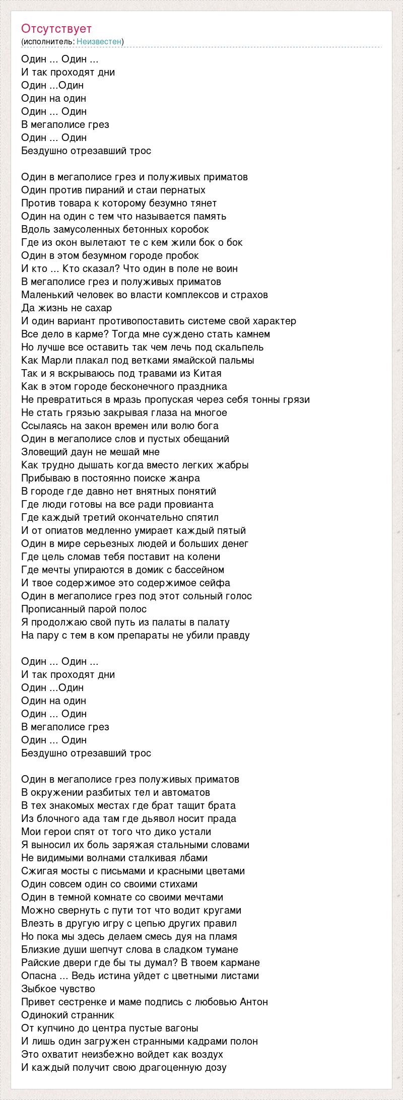 Один ... Один ... И так проходят дни Один ...Один Один на один Один ... Один В мегаполисе грез Один ... Один Бездушно отрезавший трос Один в мегаполисе грез и полуживых приматов Один против пираний и стаи пернатых Против товара к которому безумно тянет Один на один с тем что называется память Вдоль замусоленных бетонных коробок Где из окон вылетают те с кем жили бок о бок Один в этом безумном городе пробок И кто ... Кто сказал? Что один в поле не воин В мегаполисе грез и полуживых приматов Маленький человек во власти комплексов и страхов Да жизнь не сахар И один вариант противопоставить системе свой характер Все дело в карме? Тогда мне суждено стать камнем Но лучше все оставить так чем лечь под скальпель Как Марли плакал под ветками ямайской пальмы Так и я вскрываюсь под травами из Китая Как в этом городе бесконечного праздника Не превратиться в мразь пропуская через себя тонны грязи Не стать грязью закрывая глаза на многое Ссылаясь на закон времен или волю бога Один в мегаполисе слов и пустых обещаний Зловещий даун не мешай мне Как трудно дышать когда вместо легких жабры Прибываю в постоянно поиске жанра В городе где давно нет внятных понятий Где люди готовы на все ради провианта Где каждый третий окончательно спятил И от опиатов медленно умирает каждый пятый Один в мире серьезных людей и больших денег Где цель сломав тебя поставит на колени Где мечты упираются в домик с бассейном И твое содержимое это содержимое сейфа Один в мегаполисе грез под этот сольный голос Прописанный парой полос Я продолжаю свой путь из палаты в палату На пару с тем в ком препараты не убили правду Один ... Один ... И так проходят дни Один ...Один Один на один Один ... Один В мегаполисе грез Один ... Один Бездушно отрезавший трос Один в мегаполисе грез полуживых приматов В окружении разбитых тел и автоматов В тех знакомых местах где брат тащит брата Из блочного ада там где дьявол носит прада Мои герои спят от того что дико устали Я выносил их боль заряжая стальными словами Не видимыми волнами сталкивая лбами Сжигая мосты с письмами и красными цветами Один совсем один со своими стихами Один в темной комнате со своими мечтами Можно свернуть с пути тот что водит кругами Влезть в другую игру с цепью других правил Но пока мы здесь делаем смесь дуя на пламя Близкие души шепчут слова в сладком тумане Райские двери где бы ты думал? В твоем кармане Опасна ... Ведь истина уйдет с цветными листами Зыбкое чувство Привет сестренке и маме подпись с любовью Антон Одинокий странник От купчино до центра пустые вагоны И лишь один загружен странными кадрами полон Это охватит неизбежно войдет как воздух И каждый получит свою драгоценную дозу