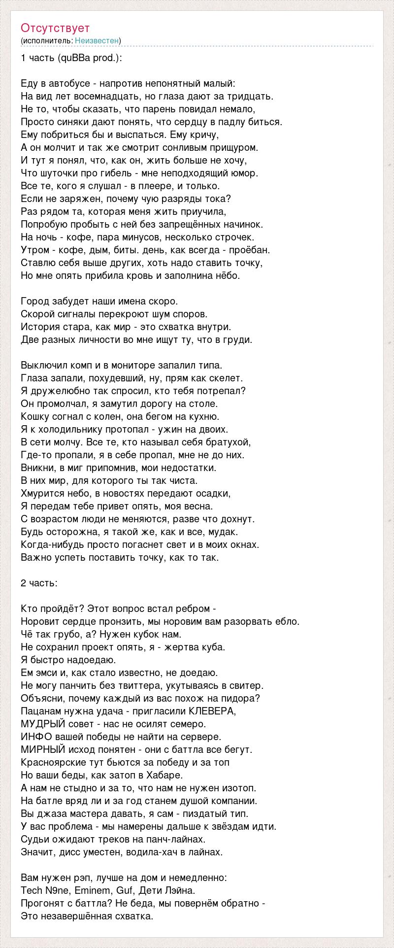 1 часть (quBBa prod.): Еду в автобусе - напротив непонятный малый: На вид лет восемнадцать, но глаза дают за тридцать. Не то, чтобы сказать, что парень повидал немало, Просто синяки дают понять, что сердцу в падлу биться. Ему побриться бы и выспаться. Ему кричу, А он молчит и так же смотрит сонливым прищуром. И тут я понял, что, как он, жить больше не хочу, Что шуточки про гибель - мне неподходящий юмор. Все те, кого я слушал - в плеере, и только. Если не заряжен, почему чую разряды тока? Раз рядом та, которая меня жить приучила, Попробую пробыть с ней без запрещённых начинок. На ночь - кофе, пара минусов, несколько строчек. Утром - кофе, дым, биты. день, как всегда - проёбан. Ставлю себя выше других, хоть надо ставить точку, Но мне опять прибила кровь и заполнина нёбо. Город забудет наши имена скоро. Скорой сигналы перекроют шум споров. История стара, как мир - это схватка внутри. Две разных личности во мне ищут ту, что в груди. Выключил комп и в мониторе запалил типа. Глаза запали, похудевший, ну, прям как скелет. Я дружелюбно так спросил, кто тебя потрепал? Он промолчал, я замутил дорогу на столе. Кошку согнал с колен, она бегом на кухню. Я к холодильнику протопал - ужин на двоих. В сети молчу. Все те, кто называл себя братухой, Где-то пропали, я в себе пропал, мне не до них. Вникни, в миг припомнив, мои недостатки. В них мир, для которого ты так чиста. Хмурится небо, в новостях передают осадки, Я передам тебе привет опять, моя весна. С возрастом люди не меняются, разве что дохнут. Будь осторожна, я такой же, как и все, мудак. Когда-нибудь просто погаснет свет и в моих окнах. Важно успеть поставить точку, как то так. 2 часть: Кто пройдёт? Этот вопрос встал ребром - Норовит сердце пронзить, мы норовим вам разорвать ебло. Чё так грубо, а? Нужен кубок нам. Не сохранил проект опять, я - жертва куба. Я быстро надоедаю. Ем эмси и, как стало известно, не доедаю. Не могу панчить без твиттера, укутываясь в свитер. Объясни, почему каждый из вас похож на пидора? Пацанам нужна удача - пригласили КЛЕВЕРА, МУДРЫЙ совет - нас не осилят семеро. ИНФО вашей победы не найти на сервере. МИРНЫЙ исход понятен - они с баттла все бегут. Красноярские тут бьются за победу и за топ Но ваши беды, как затоп в Хабаре. А нам не стыдно и за то, что нам не нужен изотоп. На батле вряд ли и за год станем душой компании. Вы джаза мастера давать, я сам - пиздатый тип. У вас проблема - мы намерены дальше к звёздам идти. Судьи ожидают треков на панч-лайнах. Значит, дисс уместен, водила-хач в лайнах. Вам нужен рэп, лучше на дом и немедленно: Tech N9ne, Eminem, Guf, Дети Лэйна. Прогонят с баттла? Не беда, мы повернём обратно - Это незавершённая схватка.