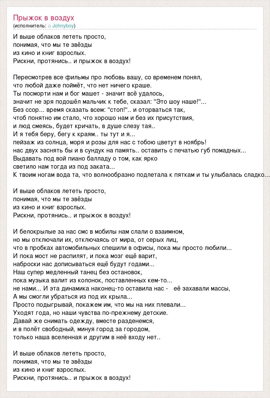 И выше облаков лететь просто, понимая, что мы те звёзды из кино и книг взрослых. Рискни, протянись.. и прыжок в воздух! Пересмотрев все фильмы про любовь вашу, со временем понял, что любой даже поймёт, что нет ничего краше. Ты посморти нам и бог машет - значит всё удалось, значит не зря подошёл мальчик к тебе, сказал: ''Это шоу наше!''... Без ссор... время сказать всем: ''стоп!''.. и оторваться так, чтоб понятно им стало, что хорошо нам и без их присутствия, и люд смеясь, будет кричать, в душе слезу тая.. И я тебя беру, бегу к краям.. ты тут и я... пейзаж из солнца, моря и розы для нас с тобою цветут в ноябрь! нас двух заснять бы и в сундук на память.. оставить с печатью губ помадных... Выдавать под вой пиано балладу о том, как ярко светило нам тогда из под заката... К твоим ногам вода та, что волнообразно подлетала к пяткам и ты улыбалась сладко... И выше облаков лететь просто, понимая, что мы те звёзды из кино и книг взрослых. Рискни, протянись.. и прыжок в воздух! И белокрылые за нас смс в мобилы нам слали о взаимном, но мы отключали их, отключаясь от мира, от серых лиц, что в пробках автомобильных спешили в офисы, пока мы просто любили... И пока мост не распилят, и пока мозг ещё варит, наброски нас дописываться ещё будут годами... Наш супер медленный танец без остановок, пока музыка валит из колонок, поставленных кем-то... не нами... И эта динамика наконец-то оставила нас - её захавали массы, А мы смогли убраться из под их крыла... Просто подыгрывай, покажем им, что мы на них плевали... Уходят года, но наши чувства по-прежнему детские. Давай же снимать одежду, вместе разденемся, и в полёт свободный, минуя город за городом, только наша вселенная и другим в неё входу нет.. И выше облаков лететь просто, понимая, что мы те звёзды из кино и книг взрослых. Рискни, протянись.. и прыжок в воздух!