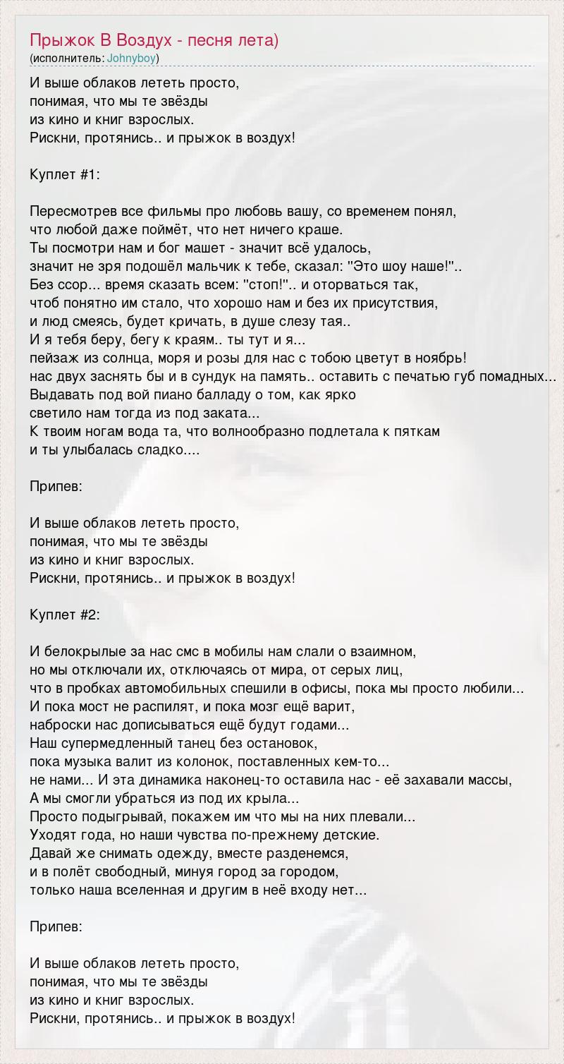 И выше облаков лететь просто, понимая, что мы те звёзды из кино и книг взрослых. Рискни, протянись.. и прыжок в воздух! Куплет #1: Пересмотрев все фильмы про любовь вашу, со временем понял, что любой даже поймёт, что нет ничего краше. Ты посмотри нам и бог машет - значит всё удалось, значит не зря подошёл мальчик к тебе, сказал: ''Это шоу наше!''.. Без ссор... время сказать всем: ''стоп!''.. и оторваться так, чтоб понятно им стало, что хорошо нам и без их присутствия, и люд смеясь, будет кричать, в душе слезу тая.. И я тебя беру, бегу к краям.. ты тут и я... пейзаж из солнца, моря и розы для нас с тобою цветут в ноябрь! нас двух заснять бы и в сундук на память.. оставить с печатью губ помадных... Выдавать под вой пиано балладу о том, как ярко светило нам тогда из под заката... К твоим ногам вода та, что волнообразно подлетала к пяткам и ты улыбалась сладко.... Припев: И выше облаков лететь просто, понимая, что мы те звёзды из кино и книг взрослых. Рискни, протянись.. и прыжок в воздух! Куплет #2: И белокрылые за нас смс в мобилы нам слали о взаимном, но мы отключали их, отключаясь от мира, от серых лиц, что в пробках автомобильных спешили в офисы, пока мы просто любили... И пока мост не распилят, и пока мозг ещё варит, наброски нас дописываться ещё будут годами... Наш супермедленный танец без остановок, пока музыка валит из колонок, поставленных кем-то... не нами... И эта динамика наконец-то оставила нас - её захавали массы, А мы смогли убраться из под их крыла... Просто подыгрывай, покажем им что мы на них плевали... Уходят года, но наши чувства по-прежнему детские. Давай же снимать одежду, вместе разденемся, и в полёт свободный, минуя город за городом, только наша вселенная и другим в неё входу нет... Припев: И выше облаков лететь просто, понимая, что мы те звёзды из кино и книг взрослых. Рискни, протянись.. и прыжок в воздух!