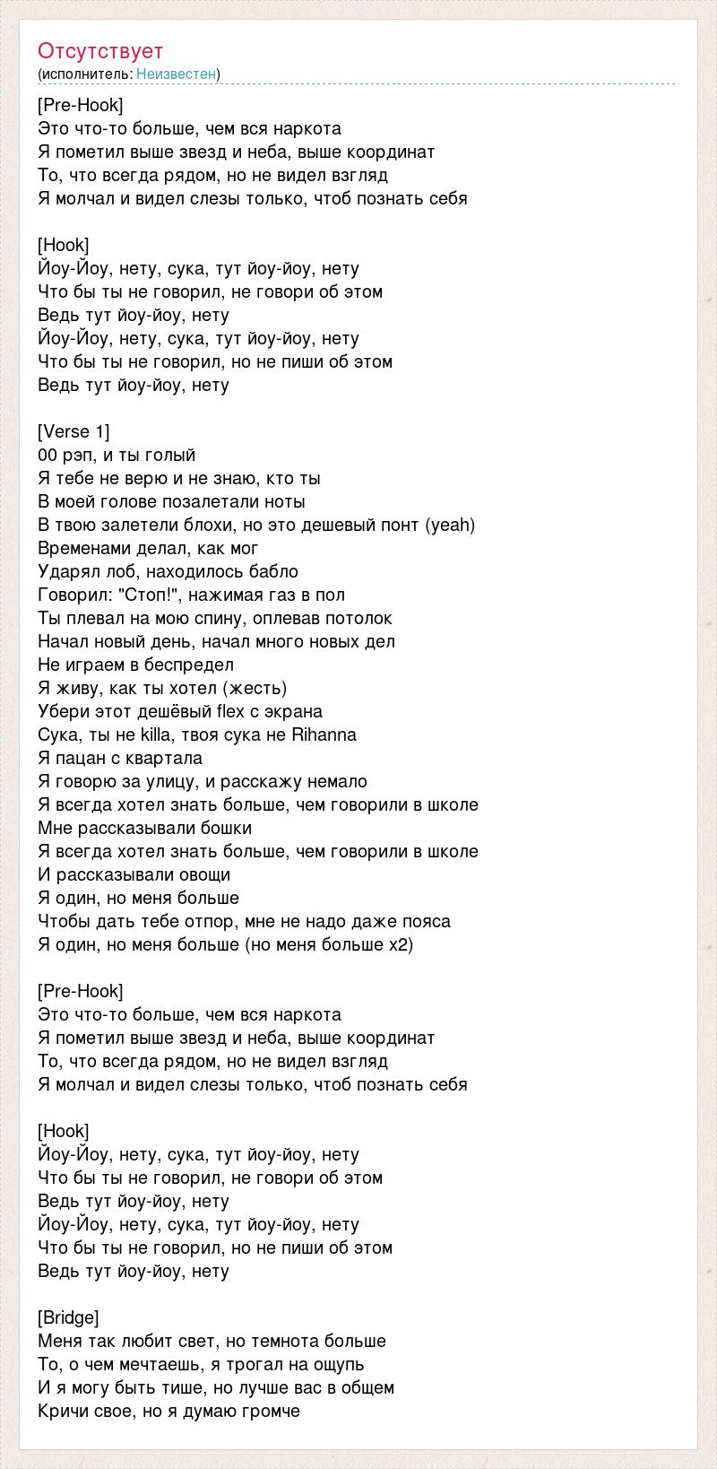 [Pre-Hook] Это что-то больше, чем вся наркота Я пометил выше звезд и неба, выше координат То, что всегда рядом, но не видел взгляд Я молчал и видел слезы только, чтоб познать себя [Hook] Йоу-Йоу, нету, сука, тут йоу-йоу, нету Что бы ты не говорил, не говори об этом Ведь тут йоу-йоу, нету Йоу-Йоу, нету, сука, тут йоу-йоу, нету Что бы ты не говорил, но не пиши об этом Ведь тут йоу-йоу, нету [Verse 1] 00 рэп, и ты голый Я тебе не верю и не знаю, кто ты В моей голове позалетали ноты В твою залетели блохи, но это дешевый понт (yeah) Временами делал, как мог Ударял лоб, находилось бабло Говорил: "Стоп!", нажимая газ в пол Ты плевал на мою спину, оплевав потолок Начал новый день, начал много новых дел Не играем в беспредел Я живу, как ты хотел (жесть) Убери этот дешёвый flex с экрана Сука, ты не killa, твоя сука не Rihanna Я пацан с квартала Я говорю за улицу, и расскажу немало Я всегда хотел знать больше, чем говорили в школе Мне рассказывали бошки Я всегда хотел знать больше, чем говорили в школе И рассказывали овощи Я один, но меня больше Чтобы дать тебе отпор, мне не надо даже пояса Я один, но меня больше (но меня больше x2) [Pre-Hook] Это что-то больше, чем вся наркота Я пометил выше звезд и неба, выше координат То, что всегда рядом, но не видел взгляд Я молчал и видел слезы только, чтоб познать себя [Hook] Йоу-Йоу, нету, сука, тут йоу-йоу, нету Что бы ты не говорил, не говори об этом Ведь тут йоу-йоу, нету Йоу-Йоу, нету, сука, тут йоу-йоу, нету Что бы ты не говорил, но не пиши об этом Ведь тут йоу-йоу, нету [Bridge] Меня так любит свет, но темнота больше То, о чем мечтаешь, я трогал на ощупь И я могу быть тише, но лучше вас в общем Кричи свое, но я думаю громче