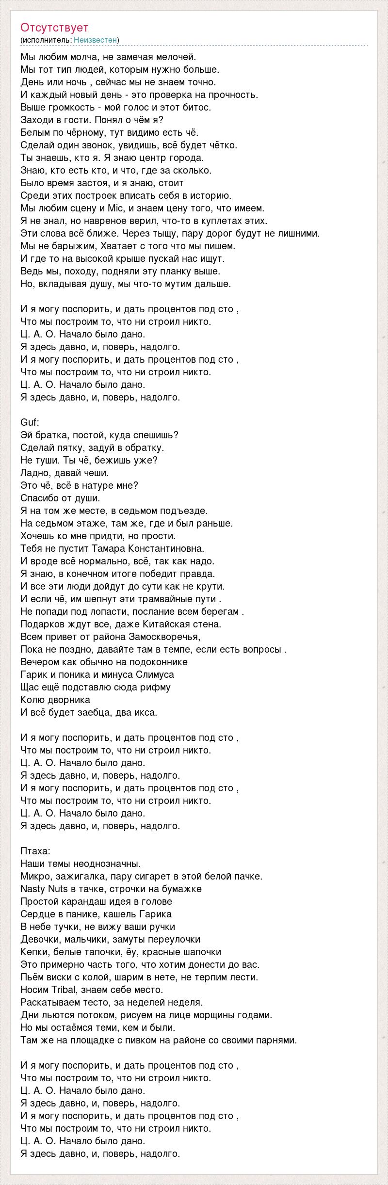 Мы любим молча, не замечая мелочей. Мы тот тип людей, которым нужно больше. День или ночь , сейчас мы не знаем точно. И каждый новый день - это проверка на прочность. Выше громкость - мой голос и этот битос. Заходи в гости. Понял о чём я? Белым по чёрному, тут видимо есть чё. Сделай один звонок, увидишь, всё будет чётко. Ты знаешь, кто я. Я знаю центр города. Знаю, кто есть кто, и что, где за сколько. Было время застоя, и я знаю, стоит Среди этих построек вписать себя в историю. Мы любим сцену и Mic, и знаем цену того, что имеем. Я не знал, но навреное верил, что-то в куплетах этих. Эти слова всё ближе. Через тыщу, пару дорог будут не лишними. Мы не барыжим, Хватает с того что мы пишем. И где то на высокой крыше пускай нас ищут. Ведь мы, походу, подняли эту планку выше. Но, вкладывая душу, мы что-то мутим дальше. И я могу поспорить, и дать процентов под сто , Что мы построим то, что ни строил никто. Ц. А. О. Начало было дано. Я здесь давно, и, поверь, надолго. И я могу поспорить, и дать процентов под сто , Что мы построим то, что ни строил никто. Ц. А. О. Начало было дано. Я здесь давно, и, поверь, надолго. Guf: Эй братка, постой, куда спешишь? Сделай пятку, задуй в обратку. Не туши. Ты чё, бежишь уже? Ладно, давай чеши. Это чё, всё в натуре мне? Спасибо от души. Я на том же месте, в седьмом подъезде. На седьмом этаже, там же, где и был раньше. Хочешь ко мне придти, но прости. Тебя не пустит Тамара Константиновна. И вроде всё нормально, всё, так как надо. Я знаю, в конечном итоге победит правда. И все эти люди дойдут до сути как не крути. И если чё, им шепнут эти трамвайные пути . Не попади под лопасти, послание всем берегам . Подарков ждут все, даже Китайская стена. Всем привет от района Замоскворечья, Пока не поздно, давайте там в темпе, если есть вопросы . Вечером как обычно на подоконнике Гарик и поника и минуса Слимуса Щас ещё подставлю сюда рифму Колю дворника И всё будет заебца, два икса. И я могу поспорить, и дать процентов под сто , Что мы построим то, что ни строил никто. Ц. А. О. Начало было дано. Я здесь давно, и, поверь, надолго. И я могу поспорить, и дать процентов под сто , Что мы построим то, что ни строил никто. Ц. А. О. Начало было дано. Я здесь давно, и, поверь, надолго. Птаха: Наши темы неоднозначны. Микро, зажигалка, пару сигарет в этой белой пачке. Nasty Nuts в тачке, строчки на бумажке Простой карандаш идея в голове Сердце в панике, кашель Гарика В небе тучки, не вижу ваши ручки Девочки, мальчики, замуты переулочки Кепки, белые тапочки, ёу, красные шапочки Это примерно часть того, что хотим донести до вас. Пьём виски с колой, шарим в нете, не терпим лести. Носим Tribal, знаем себе место. Раскатываем тесто, за неделей неделя. Дни льются потоком, рисуем на лице морщины годами. Но мы остаёмся теми, кем и были. Там же на площадке с пивком на районе со своими парнями. И я могу поспорить, и дать процентов под сто , Что мы построим то, что ни строил никто. Ц. А. О. Начало было дано. Я здесь давно, и, поверь, надолго. И я могу поспорить, и дать процентов под сто , Что мы построим то, что ни строил никто. Ц. А. О. Начало было дано. Я здесь давно, и, поверь, надолго.