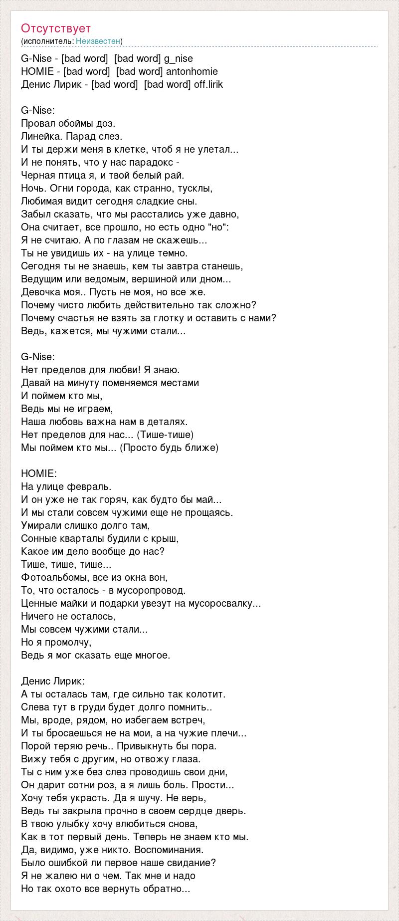 G-Nise - [bad word] [bad word] g_nise HOMIE - [bad word] [bad word] antonhomie Денис Лирик - [bad word] [bad word] off.lirik G-Nise: Провал обоймы доз. Линейка. Парад слез. И ты держи меня в клетке, чтоб я не улетал... И не понять, что у нас парадокс - Черная птица я, и твой белый рай. Ночь. Огни города, как странно, тусклы, Любимая видит сегодня сладкие сны. Забыл сказать, что мы расстались уже давно, Она считает, все прошло, но есть одно "но": Я не считаю. А по глазам не скажешь... Ты не увидишь их - на улице темно. Сегодня ты не знаешь, кем ты завтра станешь, Ведущим или ведомым, вершиной или дном... Девочка моя.. Пусть не моя, но все же. Почему чисто любить действительно так сложно? Почему счастья не взять за глотку и оставить с нами? Ведь, кажется, мы чужими стали... G-Nise: Нет пределов для любви! Я знаю. Давай на минуту поменяемся местами И поймем кто мы, Ведь мы не играем, Наша любовь важна нам в деталях. Нет пределов для нас... (Тише-тише) Мы поймем кто мы... (Просто будь ближе) HOMIE: На улице февраль. И он уже не так горяч, как будто бы май... И мы стали совсем чужими еще не прощаясь. Умирали слишко долго там, Сонные кварталы будили с крыш, Какое им дело вообще до нас? Тише, тише, тише... Фотоальбомы, все из окна вон, То, что осталось - в мусоропровод. Ценные майки и подарки увезут на мусоросвалку... Ничего не осталось, Мы совсем чужими стали... Но я промолчу, Ведь я мог сказать еще многое. Денис Лирик: А ты осталась там, где сильно так колотит. Слева тут в груди будет долго помнить.. Мы, вроде, рядом, но избегаем встреч, И ты бросаешься не на мои, а на чужие плечи... Порой теряю речь.. Привыкнуть бы пора. Вижу тебя с другим, но отвожу глаза. Ты с ним уже без слез проводишь свои дни, Он дарит сотни роз, а я лишь боль. Прости... Хочу тебя украсть. Да я шучу. Не верь, Ведь ты закрыла прочно в своем сердце дверь. В твою улыбку хочу влюбиться снова, Как в тот первый день. Теперь не знаем кто мы. Да, видимо, уже никто. Воспоминания. Было ошибкой ли первое наше свидание? Я не жалею ни о чем. Так мне и надо Но так охото все вернуть обратно...