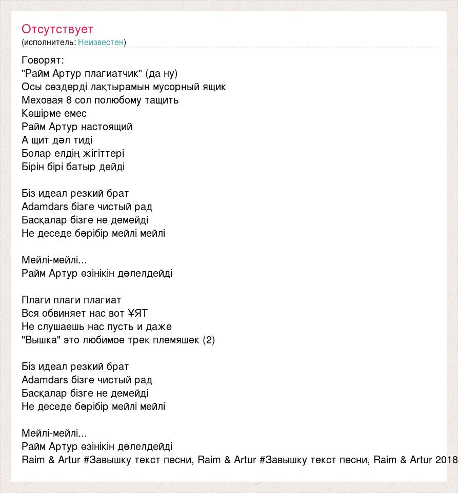 Говорят: "Райм Артур плагиатчик" (да ну) Осы сөздерді лақтырамын мусорный ящик Меховая 8 сол полюбому тащить Көшірме емес Райм Артур настоящий А щит дəл тиді Болар елдің жігіттері Бірін бірі батыр дейді Біз идеал резкий брат Adamdars бізге чистый рад Басқалар бізге не демейді Не деседе бəрібір мейлі мейлі Мейлі-мейлі... Райм Артур өзінікін дəлелдейді Плаги плаги плагиат Вся обвиняет нас вот ҰЯТ Не слушаешь нас пусть и даже "Вышка" это любимое трек племяшек (2) Біз идеал резкий брат Adamdars бізге чистый рад Басқалар бізге не демейді Не деседе бəрібір мейлі мейлі Мейлі-мейлі... Райм Артур өзінікін дəлелдейді Raim & Artur #Завышку текст песни, Raim & Artur #Завышку текст песни, Raim & Artur 2018