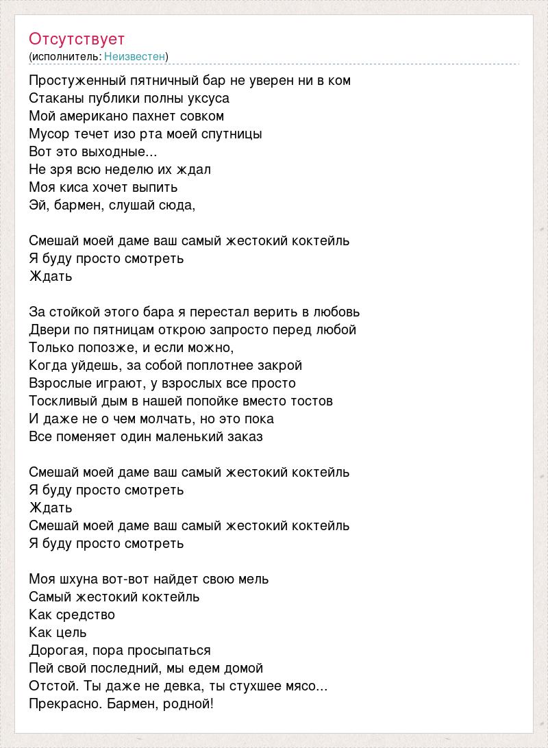Простуженный пятничный бар не уверен ни в ком Стаканы публики полны уксуса Мой американо пахнет совком Мусор течет изо рта моей спутницы Вот это выходные... Не зря всю неделю их ждал Моя киса хочет выпить Эй, бармен, слушай сюда, Смешай моей даме ваш самый жестокий коктейль Я буду просто смотреть Ждать За стойкой этого бара я перестал верить в любовь Двери по пятницам открою запросто перед любой Только попозже, и если можно, Когда уйдешь, за собой поплотнее закрой Взрослые играют, у взрослых все просто Тоскливый дым в нашей попойке вместо тостов И даже не о чем молчать, но это пока Все поменяет один маленький заказ Смешай моей даме ваш самый жестокий коктейль Я буду просто смотреть Ждать Смешай моей даме ваш самый жестокий коктейль Я буду просто смотреть Моя шхуна вот-вот найдет свою мель Самый жестокий коктейль Как средство Как цель Дорогая, пора просыпаться Пей свой последний, мы едем домой Отстой. Ты даже не девка, ты стухшее мясо... Прекрасно. Бармен, родной!
