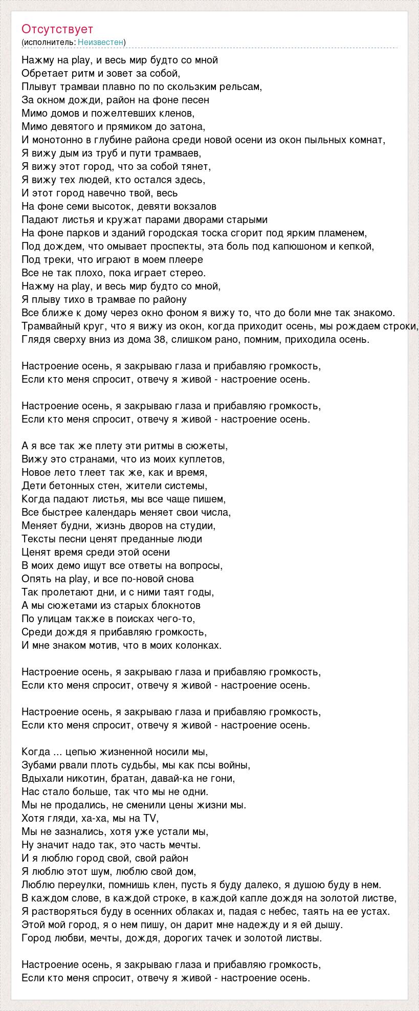 Нажму на play, и весь мир будто со мной Обретает ритм и зовет за собой, Плывут трамваи плавно по по скользким рельсам, За окном дожди, район на фоне песен Мимо домов и пожелтевших кленов, Мимо девятого и прямиком до затона, И монотонно в глубине района среди новой осени из окон пыльных комнат, Я вижу дым из труб и пути трамваев, Я вижу этот город, что за собой тянет, Я вижу тех людей, кто остался здесь, И этот город навечно твой, весь На фоне семи высоток, девяти вокзалов Падают листья и кружат парами дворами старыми На фоне парков и зданий городская тоска сгорит под ярким пламенем, Под дождем, что омывает проспекты, эта боль под капюшоном и кепкой, Под треки, что играют в моем плеере Все не так плохо, пока играет стерео. Нажму на play, и весь мир будто со мной, Я плыву тихо в трамвае по району Все ближе к дому через окно фоном я вижу то, что до боли мне так знакомо. Трамвайный круг, что я вижу из окон, когда приходит осень, мы рождаем строки, Глядя сверху вниз из дома 38, слишком рано, помним, приходила осень. Настроение осень, я закрываю глаза и прибавляю громкость, Если кто меня спросит, отвечу я живой - настроение осень. Настроение осень, я закрываю глаза и прибавляю громкость, Если кто меня спросит, отвечу я живой - настроение осень. А я все так же плету эти ритмы в сюжеты, Вижу это странами, что из моих куплетов, Новое лето тлеет так же, как и время, Дети бетонных стен, жители системы, Когда падают листья, мы все чаще пишем, Все быстрее календарь меняет свои числа, Меняет будни, жизнь дворов на студии, Тексты песни ценят преданные люди Ценят время среди этой осени В моих демо ищут все ответы на вопросы, Опять на play, и все по-новой снова Так пролетают дни, и с ними таят годы, А мы сюжетами из старых блокнотов По улицам также в поисках чего-то, Среди дождя я прибавляю громкость, И мне знаком мотив, что в моих колонках. Настроение осень, я закрываю глаза и прибавляю громкость, Если кто меня спросит, отвечу я живой - настроение осень. Настроение осень, я закрываю глаза и прибавляю громкость, Если кто меня спросит, отвечу я живой - настроение осень. Когда ... цепью жизненной носили мы, Зубами рвали плоть судьбы, мы как псы войны, Вдыхали никотин, братан, давай-ка не гони, Нас стало больше, так что мы не одни. Мы не продались, не сменили цены жизни мы. Хотя гляди, ха-ха, мы на TV, Мы не зазнались, хотя уже устали мы, Ну значит надо так, это часть мечты. И я люблю город свой, свой район Я люблю этот шум, люблю свой дом, Люблю переулки, помнишь клен, пусть я буду далеко, я душою буду в нем. В каждом слове, в каждой строке, в каждой капле дождя на золотой листве, Я растворяться буду в осенних облаках и, падая с небес, таять на ее устах. Этой мой город, я о нем пишу, он дарит мне надежду и я ей дышу. Город любви, мечты, дождя, дорогих тачек и золотой листвы. Настроение осень, я закрываю глаза и прибавляю громкость, Если кто меня спросит, отвечу я живой - настроение осень.