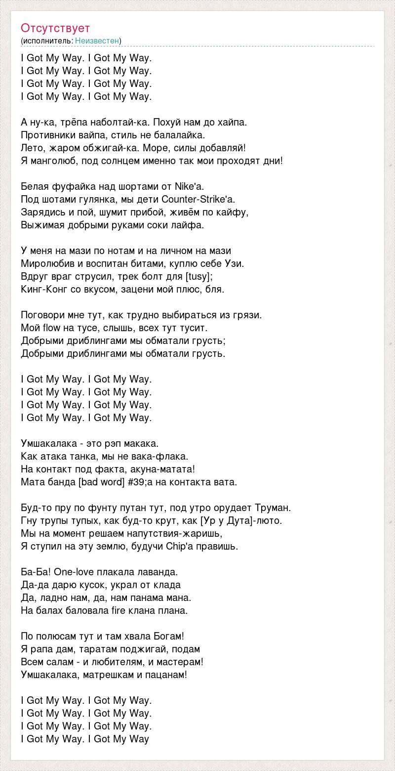 I Got My Way. I Got My Way. I Got My Way. I Got My Way. I Got My Way. I Got My Way. I Got My Way. I Got My Way. А ну-ка, трёпа наболтай-ка. Похуй нам до хайпа. Противники вайпа, стиль не балалайка. Лето, жаром обжигай-ка. Море, силы добавляй! Я манголюб, под солнцем именно так мои проходят дни! Белая фуфайка над шортами от Nike'а. Под шотами гулянка, мы дети Counter-Strike'а. Зарядись и пой, шумит прибой, живём по кайфу, Выжимая добрыми руками соки лайфа. У меня на мази по нотам и на личном на мази Миролюбив и воспитан битами, куплю себе Узи. Вдруг враг струсил, трек болт для [tusy]; Кинг-Конг со вкусом, зацени мой плюс, бля. Поговори мне тут, как трудно выбираться из грязи. Мой flow на тусе, слышь, всех тут тусит. Добрыми дриблингами мы обматали грусть; Добрыми дриблингами мы обматали грусть. I Got My Way. I Got My Way. I Got My Way. I Got My Way. I Got My Way. I Got My Way. I Got My Way. I Got My Way. Умшакалака - это рэп макака. Как атака танка, мы не вака-флака. На контакт под факта, акуна-матата! Мата банда [bad word] #39;а на контакта вата. Буд-то пру по фунту путан тут, под утро орудает Труман. Гну трупы тупых, как буд-то крут, как [Ур у Дута]-люто. Мы на момент решаем напутствия-жаришь, Я ступил на эту землю, будучи Chip'а правишь. Ба-Ба! One-love плакала лаванда. Да-да дарю кусок, украл от клада Да, ладно нам, да, нам панама мана. На балах баловала fire клана плана. По полюсам тут и там хвала Богам! Я рапа дам, таратам поджигай, подам Всем салам - и любителям, и мастерам! Умшакалака, матрешкам и пацанам! I Got My Way. I Got My Way. I Got My Way. I Got My Way. I Got My Way. I Got My Way. I Got My Way. I Got My Way