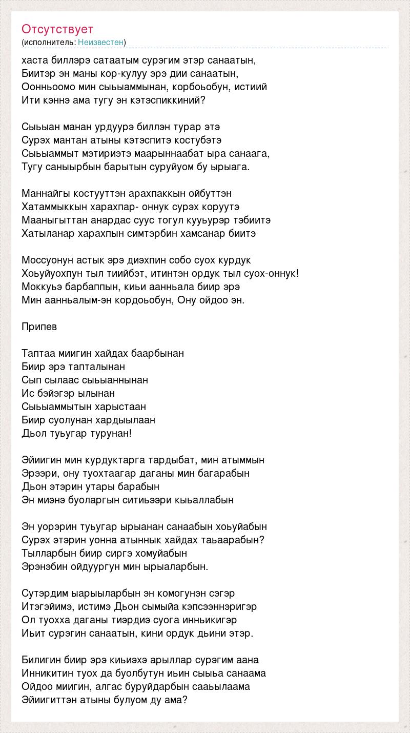 хаста биллэрэ сатаатым сурэгим этэр санаатын, Биитэр эн маны кор-кулуу эрэ дии санаатын, Оонньоомо мин сыьыаммынан, корбоьобун, истиий Ити кэннэ ама тугу эн кэтэспиккиний? Сыьыан манан урдуурэ биллэн турар этэ Сурэх мантан атыны кэтэспитэ костубэтэ Сыьыаммыт мэтириэтэ маарыннаабат ыра санаага, Тугу саныырбын барытын суруйуом бу ырыага. Маннайгы костууттэн арахпаккын ойбуттэн Хатаммыккын харахпар- оннук сурэх коруутэ Мааныгыттан анардас суус тогул кууьурэр тэбиитэ Хатыланар харахпын симтэрбин хамсанар биитэ Моссуонун астык эрэ диэхпин собо суох курдук Хоьуйуохпун тыл тиийбэт, итинтэн ордук тыл суох-оннук! Моккуьэ барбаппын, киьи аанньала биир эрэ Мин аанньалым-эн кордоьобун, Ону ойдоо эн. Припев Таптаа миигин хайдах баарбынан Биир эрэ тапталынан Сып сылаас сыьыаннынан Ис бэйэгэр ылынан Сыьыаммытын харыстаан Биир суолунан хардыылаан Дьол туьугар турунан! Эйиигин мин курдуктарга тардыбат, мин атыммын Эрээри, ону туохтаагар даганы мин багарабын Дьон этэрин утары барабын Эн миэнэ буоларгын ситиьээри кыьаллабын Эн уорэрин туьугар ырыанан санаабын хоьуйабын Сурэх этэрин уонна атыннык хайдах таьаарабын? Тылларбын биир сиргэ хомуйабын Эрэнэбин ойдуургун мин ырыаларбын. Сутэрдим ыарыыларбын эн комогунэн сэгэр Итэгэйимэ, истимэ Дьон сымыйа кэпсээннэригэр Ол туохха даганы тиэрдиэ суога инньикигэр Иьит сурэгин санаатын, кини ордук дьини этэр. Билигин биир эрэ киьиэхэ арыллар сурэгим аана Инникитин туох да буолбутун иьин сыыьа санаама Ойдоо миигин, алгас буруйдарбын сааьылаама Эйиигиттэн атыны булуом ду ама?