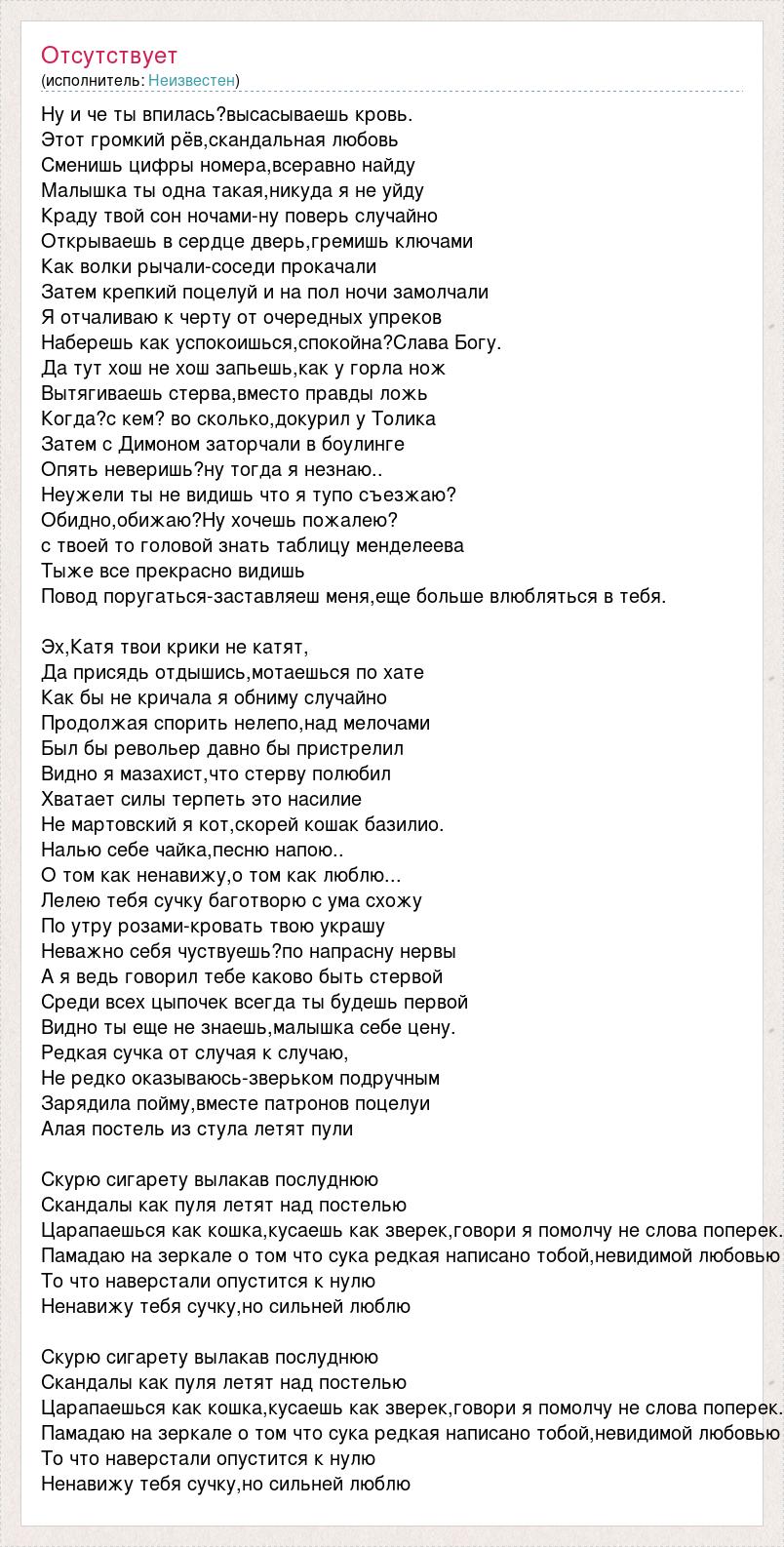 Ну и че ты впилась?высасываешь кровь. Этот громкий рёв,скандальная любовь Сменишь цифры номера,всеравно найду Малышка ты одна такая,никуда я не уйду Краду твой сон ночами-ну поверь случайно Открываешь в сердце дверь,гремишь ключами Как волки рычали-соседи прокачали Затем крепкий поцелуй и на пол ночи замолчали Я отчаливаю к черту от очередных упреков Наберешь как успокоишься,спокойна?Слава Богу. Да тут хош не хош запьешь,как у горла нож Вытягиваешь стерва,вместо правды ложь Когда?с кем? во сколько,докурил у Толика Затем с Димоном заторчали в боулинге Опять неверишь?ну тогда я незнаю.. Неужели ты не видишь что я тупо съезжаю? Обидно,обижаю?Ну хочешь пожалею? с твоей то головой знать таблицу менделеева Тыже все прекрасно видишь Повод поругаться-заставляеш меня,еще больше влюбляться в тебя. Эх,Катя твои крики не катят, Да присядь отдышись,мотаешься по хате Как бы не кричала я обниму случайно Продолжая спорить нелепо,над мелочами Был бы револьер давно бы пристрелил Видно я мазахист,что стерву полюбил Хватает силы терпеть это насилие Не мартовский я кот,скорей кошак базилио. Налью себе чайка,песню напою.. О том как ненавижу,о том как люблю... Лелею тебя сучку баготворю с ума схожу По утру розами-кровать твою украшу Неважно себя чуствуешь?по напрасну нервы А я ведь говорил тебе каково быть стервой Среди всех цыпочек всегда ты будешь первой Видно ты еще не знаешь,малышка себе цену. Редкая сучка от случая к случаю, Не редко оказываюсь-зверьком подручным Зарядила пойму,вместе патронов поцелуи Алая постель из стула летят пули Скурю сигарету вылакав послуднюю Скандалы как пуля летят над постелью Царапаешься как кошка,кусаешь как зверек,говори я помолчу не слова поперек. Памадаю на зеркале о том что сука редкая написано тобой,невидимой любовью То что наверстали опустится к нулю Ненавижу тебя сучку,но сильней люблю Скурю сигарету вылакав послуднюю Скандалы как пуля летят над постелью Царапаешься как кошка,кусаешь как зверек,говори я помолчу не слова поперек. Памадаю на зеркале о том что сука редкая написано тобой,невидимой любовью То что наверстали опустится к нулю Ненавижу тебя сучку,но сильней люблю