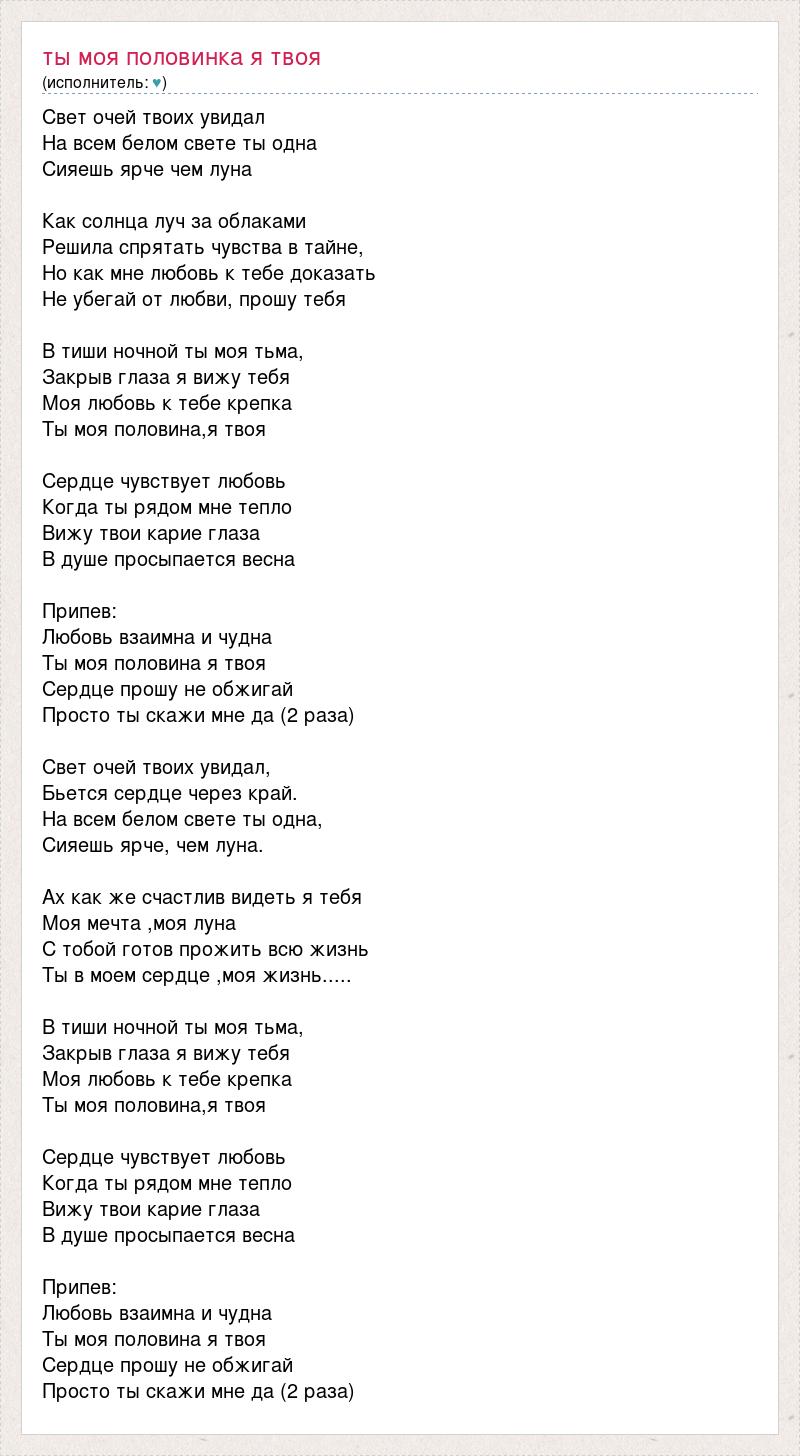 Свет очей твоих увидал На всем белом свете ты одна Сияешь ярче чем луна Как солнца луч за облаками Решила спрятать чувства в тайне, Но как мне любовь к тебе доказать Не убегай от любви, прошу тебя В тиши ночной ты моя тьма, Закрыв глаза я вижу тебя Моя любовь к тебе крепка Ты моя половина,я твоя Сердце чувствует любовь Когда ты рядом мне тепло Вижу твои карие глаза В душе просыпается весна Припев: Любовь взаимна и чудна Ты моя половина я твоя Сердце прошу не обжигай Просто ты скажи мне да (2 раза) Свет очей твоих увидал, Бьется сердце через край. На всем белом свете ты одна, Сияешь ярче, чем луна. Ах как же счастлив видеть я тебя Моя мечта ,моя луна С тобой готов прожить всю жизнь Ты в моем сердце ,моя жизнь..... В тиши ночной ты моя тьма, Закрыв глаза я вижу тебя Моя любовь к тебе крепка Ты моя половина,я твоя Сердце чувствует любовь Когда ты рядом мне тепло Вижу твои карие глаза В душе просыпается весна Припев: Любовь взаимна и чудна Ты моя половина я твоя Сердце прошу не обжигай Просто ты скажи мне да (2 раза)