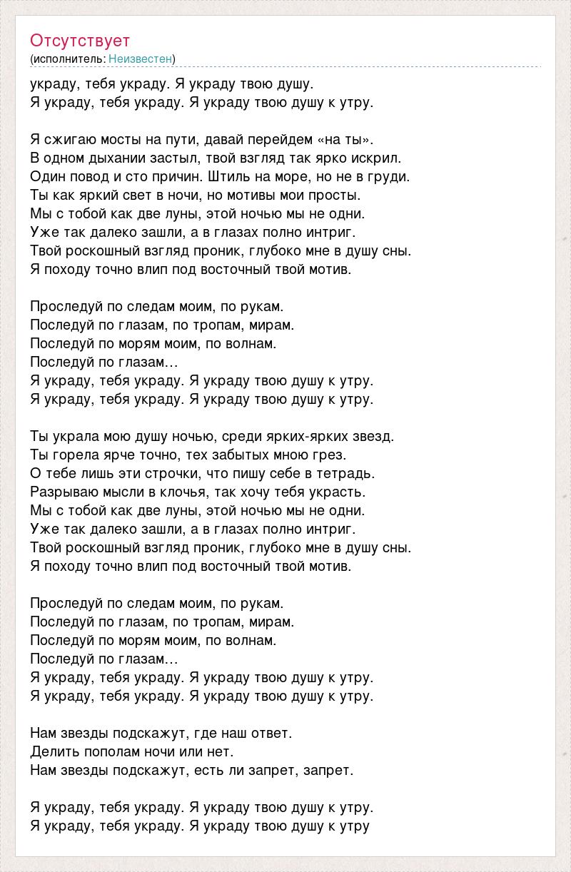 украду, тебя украду. Я украду твою душу. Я украду, тебя украду. Я украду твою душу к утру. Я сжигаю мосты на пути, давай перейдем «на ты». В одном дыхании застыл, твой взгляд так ярко искрил. Один повод и сто причин. Штиль на море, но не в груди. Ты как яркий свет в ночи, но мотивы мои просты. Мы с тобой как две луны, этой ночью мы не одни. Уже так далеко зашли, а в глазах полно интриг. Твой роскошный взгляд проник, глубоко мне в душу сны. Я походу точно влип под восточный твой мотив. Проследуй по следам моим, по рукам. Последуй по глазам, по тропам, мирам. Последуй по морям моим, по волнам. Последуй по глазам… Я украду, тебя украду. Я украду твою душу к утру. Я украду, тебя украду. Я украду твою душу к утру. Ты украла мою душу ночью, среди ярких-ярких звезд. Ты горела ярче точно, тех забытых мною грез. О тебе лишь эти строчки, что пишу себе в тетрадь. Разрываю мысли в клочья, так хочу тебя украсть. Мы с тобой как две луны, этой ночью мы не одни. Уже так далеко зашли, а в глазах полно интриг. Твой роскошный взгляд проник, глубоко мне в душу сны. Я походу точно влип под восточный твой мотив. Проследуй по следам моим, по рукам. Последуй по глазам, по тропам, мирам. Последуй по морям моим, по волнам. Последуй по глазам… Я украду, тебя украду. Я украду твою душу к утру. Я украду, тебя украду. Я украду твою душу к утру. Нам звезды подскажут, где наш ответ. Делить пополам ночи или нет. Нам звезды подскажут, есть ли запрет, запрет. Я украду, тебя украду. Я украду твою душу к утру. Я украду, тебя украду. Я украду твою душу к утру