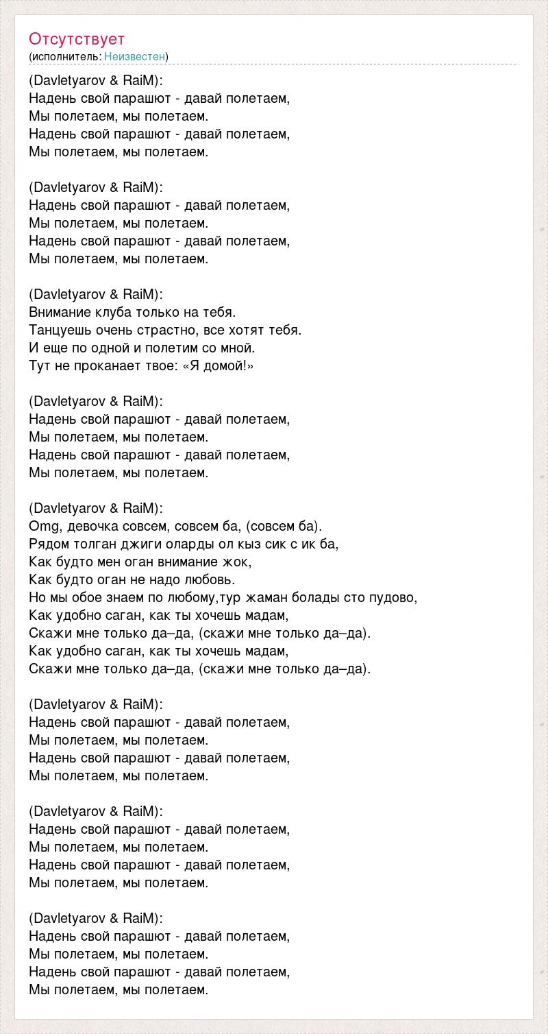 (Davletyarov & RaiM): Надень свой парашют - давай полетаем, Мы полетаем, мы полетаем. Надень свой парашют - давай полетаем, Мы полетаем, мы полетаем. (Davletyarov & RaiM): Надень свой парашют - давай полетаем, Мы полетаем, мы полетаем. Надень свой парашют - давай полетаем, Мы полетаем, мы полетаем. (Davletyarov & RaiM): Внимание клуба только на тебя. Танцуешь очень страстно, все хотят тебя. И еще по одной и полетим со мной. Тут не проканает твое: «Я домой!» (Davletyarov & RaiM): Надень свой парашют - давай полетаем, Мы полетаем, мы полетаем. Надень свой парашют - давай полетаем, Мы полетаем, мы полетаем. (Davletyarov & RaiM): Оmg, девочка совсем, совсем ба, (совсем ба). Рядом толган джиги оларды ол кыз сик с ик ба, Как будто мен оган внимание жок, Как будто оган не надо любовь. Но мы обое знаем по любому,тур жаман болады сто пудово, Как удобно саган, как ты хочешь мадам, Скажи мне только да–да, (скажи мне только да–да). Как удобно саган, как ты хочешь мадам, Скажи мне только да–да, (скажи мне только да–да). (Davletyarov & RaiM): Надень свой парашют - давай полетаем, Мы полетаем, мы полетаем. Надень свой парашют - давай полетаем, Мы полетаем, мы полетаем. (Davletyarov & RaiM): Надень свой парашют - давай полетаем, Мы полетаем, мы полетаем. Надень свой парашют - давай полетаем, Мы полетаем, мы полетаем. (Davletyarov & RaiM): Надень свой парашют - давай полетаем, Мы полетаем, мы полетаем. Надень свой парашют - давай полетаем, Мы полетаем, мы полетаем.