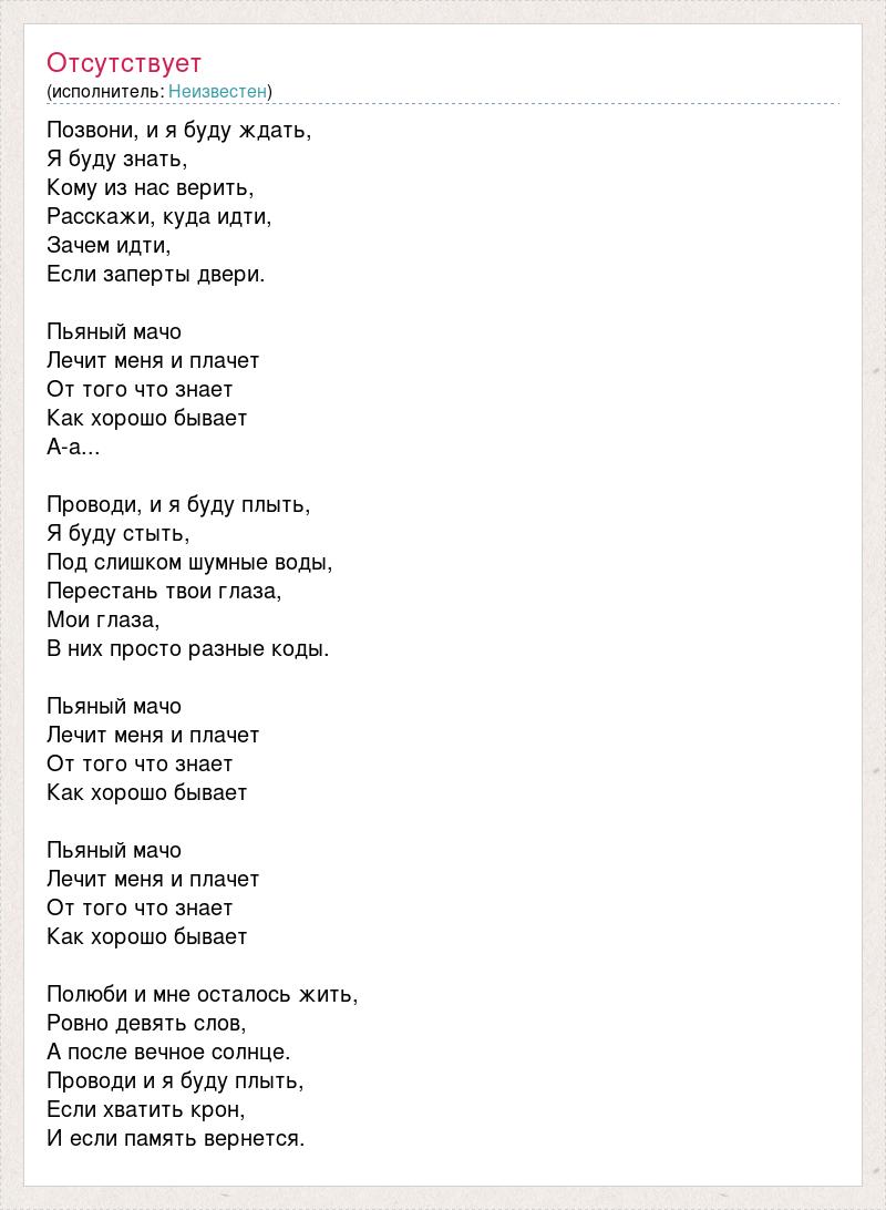 Позвони, и я буду ждать, Я буду знать, Кому из нас верить, Расскажи, куда идти, Зачем идти, Если заперты двери. Пьяный мачо Лечит меня и плачет От того что знает Как хорошо бывает А-а... Проводи, и я буду плыть, Я буду стыть, Под слишком шумные воды, Перестань твои глаза, Мои глаза, В них просто разные коды. Пьяный мачо Лечит меня и плачет От того что знает Как хорошо бывает Пьяный мачо Лечит меня и плачет От того что знает Как хорошо бывает Полюби и мне осталось жить, Ровно девять слов, А после вечное солнце. Проводи и я буду плыть, Если хватить крон, И если память вернется.