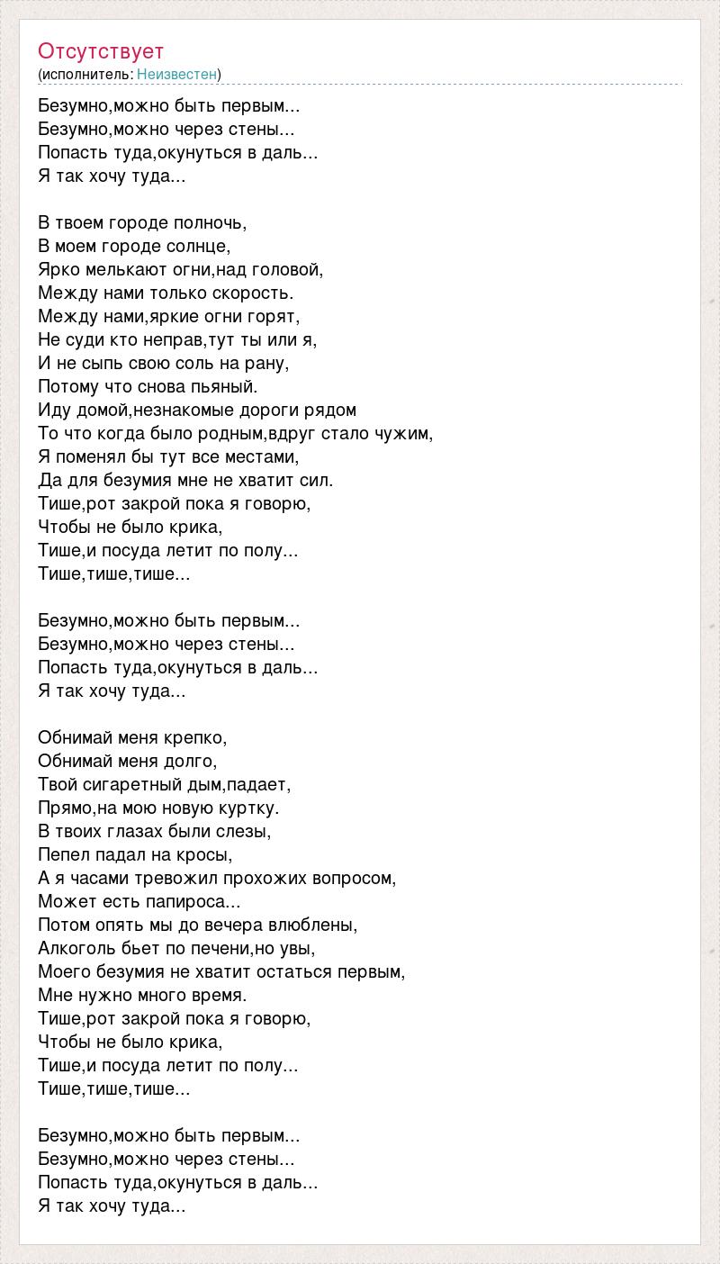 Безумно,можно быть первым... Безумно,можно через стены... Попасть туда,окунуться в даль... Я так хочу туда... В твоем городе полночь, В моем городе солнце, Ярко мелькают огни,над головой, Между нами только скорость. Между нами,яркие огни горят, Не суди кто неправ,тут ты или я, И не сыпь свою соль на рану, Потому что снова пьяный. Иду домой,незнакомые дороги рядом То что когда было родным,вдруг стало чужим, Я поменял бы тут все местами, Да для безумия мне не хватит сил. Тише,рот закрой пока я говорю, Чтобы не было крика, Тише,и посуда летит по полу... Тише,тише,тише... Безумно,можно быть первым... Безумно,можно через стены... Попасть туда,окунуться в даль... Я так хочу туда... Обнимай меня крепко, Обнимай меня долго, Твой сигаретный дым,падает, Прямо,на мою новую куртку. В твоих глазах были слезы, Пепел падал на кросы, А я часами тревожил прохожих вопросом, Может есть папироса... Потом опять мы до вечера влюблены, Алкоголь бьет по печени,но увы, Моего безумия не хватит остаться первым, Мне нужно много время. Тише,рот закрой пока я говорю, Чтобы не было крика, Тише,и посуда летит по полу... Тише,тише,тише... Безумно,можно быть первым... Безумно,можно через стены... Попасть туда,окунуться в даль... Я так хочу туда...
