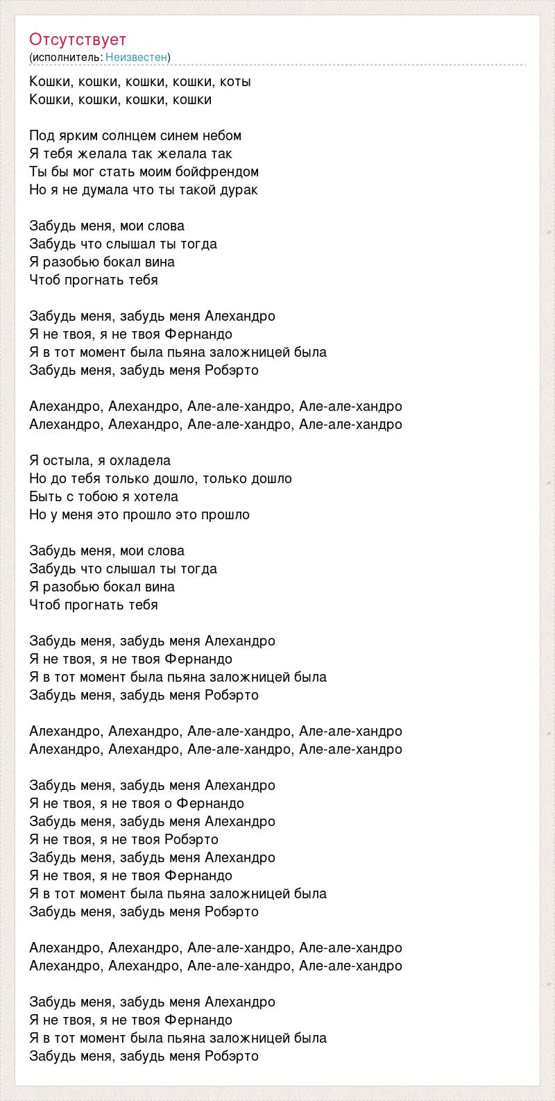 Кошки, кошки, кошки, кошки, коты Кошки, кошки, кошки, кошки Под ярким солнцем синем небом Я тебя желала так желала так Ты бы мог стать моим бойфрендом Но я не думала что ты такой дурак Забудь меня, мои слова Забудь что слышал ты тогда Я разобью бокал вина Чтоб прогнать тебя Забудь меня, забудь меня Алехандро Я не твоя, я не твоя Фернандо Я в тот момент была пьяна заложницей была Забудь меня, забудь меня Робэрто Алехандро, Алехандро, Але-але-хандро, Але-але-хандро Алехандро, Алехандро, Але-але-хандро, Але-але-хандро Я остыла, я охладела Но до тебя только дошло, только дошло Быть с тобою я хотела Но у меня это прошло это прошло Забудь меня, мои слова Забудь что слышал ты тогда Я разобью бокал вина Чтоб прогнать тебя Забудь меня, забудь меня Алехандро Я не твоя, я не твоя Фернандо Я в тот момент была пьяна заложницей была Забудь меня, забудь меня Робэрто Алехандро, Алехандро, Але-але-хандро, Але-але-хандро Алехандро, Алехандро, Але-але-хандро, Але-але-хандро Забудь меня, забудь меня Алехандро Я не твоя, я не твоя о Фернандо Забудь меня, забудь меня Алехандро Я не твоя, я не твоя Робэрто Забудь меня, забудь меня Алехандро Я не твоя, я не твоя Фернандо Я в тот момент была пьяна заложницей была Забудь меня, забудь меня Робэрто Алехандро, Алехандро, Але-але-хандро, Але-але-хандро Алехандро, Алехандро, Але-але-хандро, Але-але-хандро Забудь меня, забудь меня Алехандро Я не твоя, я не твоя Фернандо Я в тот момент была пьяна заложницей была Забудь меня, забудь меня Робэрто
