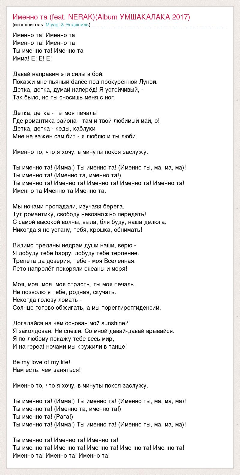 Именно та! Именно та Именно та! Именно та Ты именно та! Именно та Имма! Е! Е! Е! Давай направим эти силы в бой, Покажи мне пьяный dаnce под прокуренной Луной. Детка, детка, думай наперёд! Я устойчивый, - Так было, но ты сносишь меня с ног. Детка, детка - ты моя печаль! Где романтика района - там и твой любимый май, о! Детка, детка - кеды, каблуки Мне не важен сам бит - я люблю и ты люби. Именно то, что я хочу, в минуты покоя заслужу. Ты именно та! (Имма!) Ты именно та! (Именно ты, ма, ма, ма)! Ты именно та! (Именно та, именно та!) Ты именно та! Именно та! Именно та! Именно та! Именно та! Именно та Именно та Именно та. Мы ночами пропадали, изучаяя берега. Тут романтику, свободу невозможно передать! С самой высокой волны, выла, бля буду, наша делюга. Никогда я не устану, тебя, крошка, обнимать! Видимо преданы недрам души наши, верю - Я добуду тебе happy, добуду тебе терпение. Трепета да доверия, тебе - моя Вселенная. Лето напролёт покоряли океаны и моря! Моя, моя, моя, моя страсть, ты моя печаль. Не позволю я тебе, родная, скучать. Некогда голову ломать - Солнце готово обжигать, а мы пореггиреггиденсим. Догадайся на чём основан мой sunshine? Я заколдован. Не спеши. Со мной давай-давай врывайся. Я по-любому покажу тебе весь мир, И на repeat ночами мы кружили в танце! Be my love of my life! Нам есть, чем заняться! Именно то, что я хочу, в минуты покоя заслужу. Ты именно та! (Имма!) Ты именно та! (Именно ты, ма, ма, ма)! Ты именно та! (Именно та, именно та!) Ты именно та! (Рага!) Ты именно та! (Имма!) Ты именно та! (Именно ты, ма, ма, ма)! Ты именно та! Именно та! Именно та! Ты именно та! Именно та! Именно та! Именно та! Именно та! Именно та! Именно та! Именно та!
