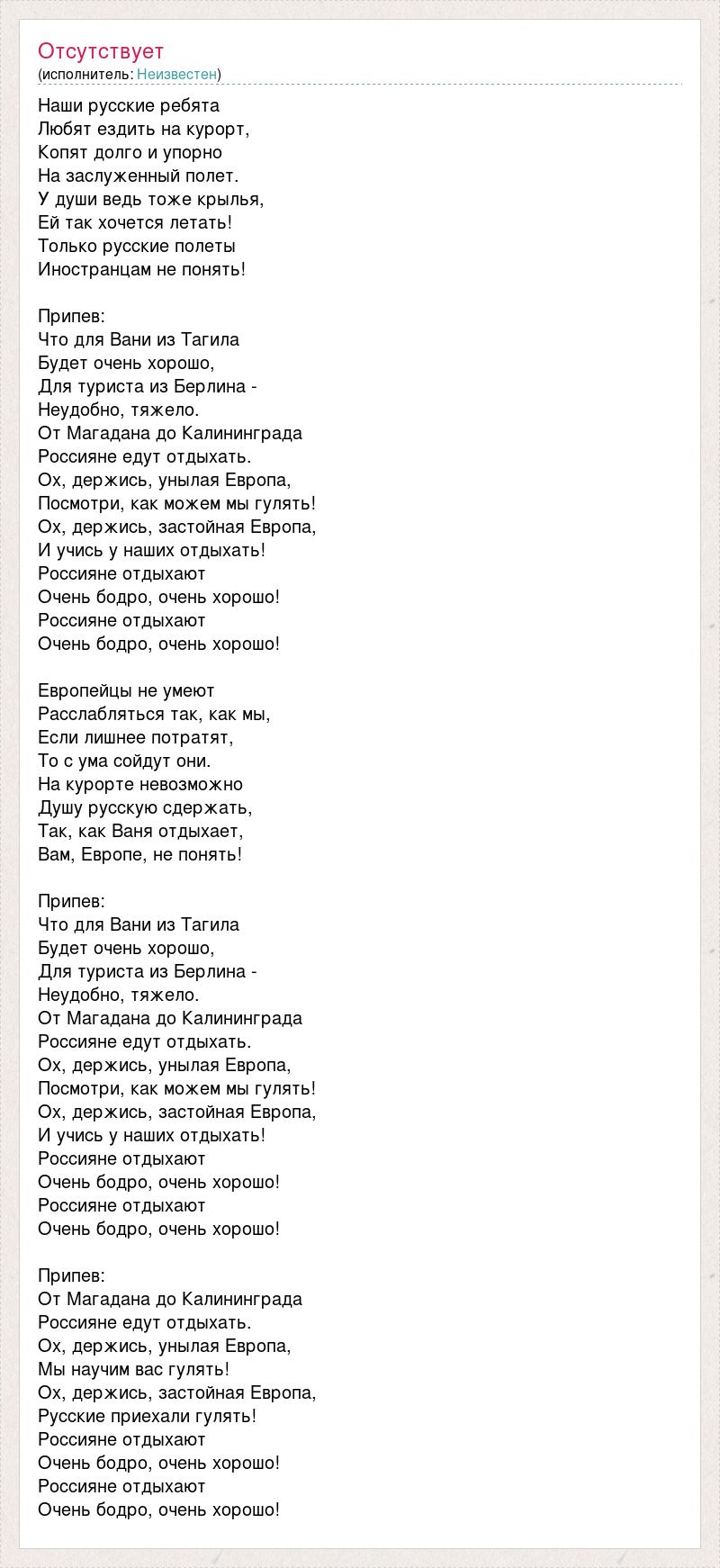 Наши русские ребята Любят ездить на курорт, Копят долго и упорно На заслуженный полет. У души ведь тоже крылья, Ей так хочется летать! Только русские полеты Иностранцам не понять! Припев: Что для Вани из Тагила Будет очень хорошо, Для туриста из Берлина - Неудобно, тяжело. От Магадана до Калининграда Россияне едут отдыхать. Ох, держись, унылая Европа, Посмотри, как можем мы гулять! Ох, держись, застойная Европа, И учись у наших отдыхать! Россияне отдыхают Очень бодро, очень хорошо! Россияне отдыхают Очень бодро, очень хорошо! Европейцы не умеют Расслабляться так, как мы, Если лишнее потратят, То с ума сойдут они. На курорте невозможно Душу русскую сдержать, Так, как Ваня отдыхает, Вам, Европе, не понять! Припев: Что для Вани из Тагила Будет очень хорошо, Для туриста из Берлина - Неудобно, тяжело. От Магадана до Калининграда Россияне едут отдыхать. Ох, держись, унылая Европа, Посмотри, как можем мы гулять! Ох, держись, застойная Европа, И учись у наших отдыхать! Россияне отдыхают Очень бодро, очень хорошо! Россияне отдыхают Очень бодро, очень хорошо! Припев: От Магадана до Калининграда Россияне едут отдыхать. Ох, держись, унылая Европа, Мы научим вас гулять! Ох, держись, застойная Европа, Русские приехали гулять! Россияне отдыхают Очень бодро, очень хорошо! Россияне отдыхают Очень бодро, очень хорошо!
