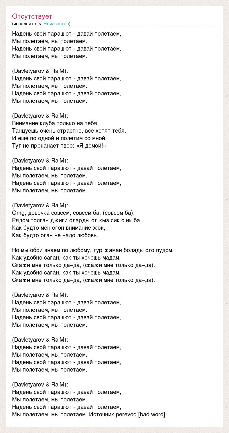 Надень свой парашют - давай полетаем, Мы полетаем, мы полетаем. Надень свой парашют - давай полетаем, Мы полетаем, мы полетаем. (Davletyarov & RaiM): Надень свой парашют - давай полетаем, Мы полетаем, мы полетаем. Надень свой парашют - давай полетаем, Мы полетаем, мы полетаем. (Davletyarov & RaiM): Внимание клуба только на тебя. Танцуешь очень страстно, все хотят тебя. И еще по одной и полетим со мной. Тут не проканает твое: «Я домой!» (Davletyarov & RaiM): Надень свой парашют - давай полетаем, Мы полетаем, мы полетаем. Надень свой парашют - давай полетаем, Мы полетаем, мы полетаем. (Davletyarov & RaiM): Оmg, девочка совсем, совсем ба, (совсем ба). Рядом толган джиги оларды ол кыз сик с ик ба, Как будто мен огон внимание жок, Как будто оган не надо любовь. Но мы обои знаем по любому, тур жаман болады сто пудом, Как удобно саган, как ты хочешь мадам, Скажи мне только да–да, (скажи мне только да–да). Как удобно саган, как ты хочешь мадам, Скажи мне только да–да, (скажи мне только да–да). (Davletyarov & RaiM): Надень свой парашют - давай полетаем, Мы полетаем, мы полетаем. Надень свой парашют - давай полетаем, Мы полетаем, мы полетаем. (Davletyarov & RaiM): Надень свой парашют - давай полетаем, Мы полетаем, мы полетаем. Надень свой парашют - давай полетаем, Мы полетаем, мы полетаем. (Davletyarov & RaiM): Надень свой парашют - давай полетаем, Мы полетаем, мы полетаем. Надень свой парашют - давай полетаем, Мы полетаем, мы полетаем. Источник perevod [bad word]