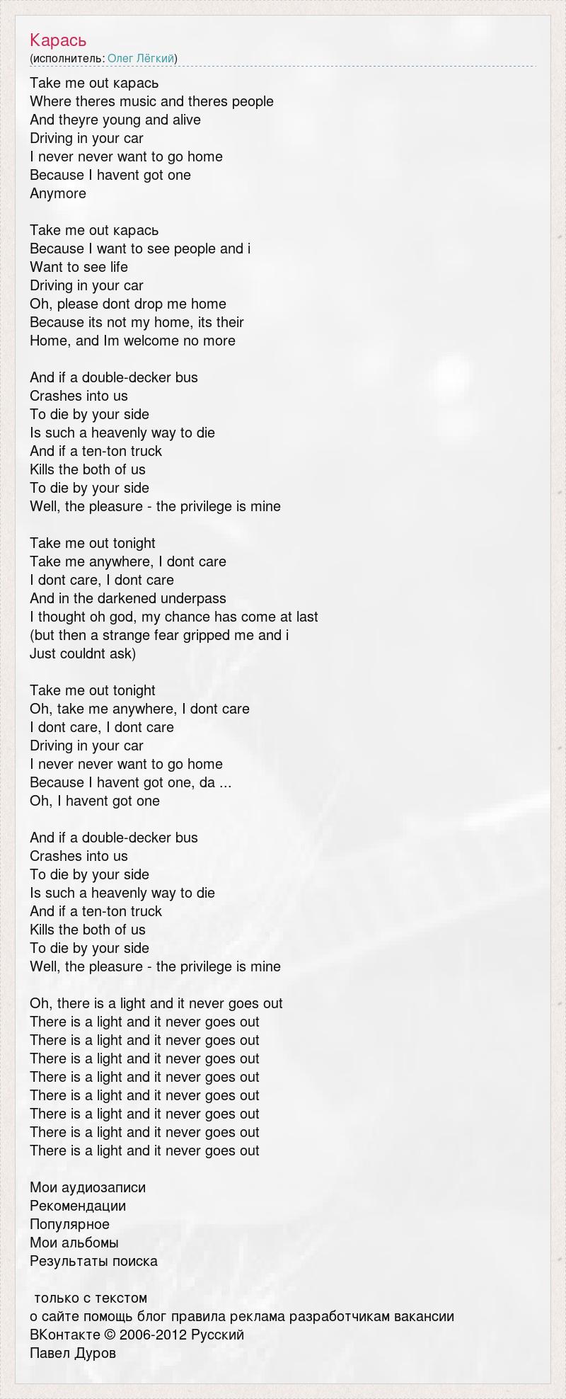 Take me out карась Where theres music and theres people And theyre young and alive Driving in your car I never never want to go home Because I havent got one Anymore Take me out карась Because I want to see people and i Want to see life Driving in your car Oh, please dont drop me home Because its not my home, its their Home, and Im welcome no more And if a double-decker bus Crashes into us To die by your side Is such a heavenly way to die And if a ten-ton truck Kills the both of us To die by your side Well, the pleasure - the privilege is mine Take me out tonight Take me anywhere, I dont care I dont care, I dont care And in the darkened underpass I thought oh god, my chance has come at last (but then a strange fear gripped me and i Just couldnt ask) Take me out tonight Oh, take me anywhere, I dont care I dont care, I dont care Driving in your car I never never want to go home Because I havent got one, da ... Oh, I havent got one And if a double-decker bus Crashes into us To die by your side Is such a heavenly way to die And if a ten-ton truck Kills the both of us To die by your side Well, the pleasure - the privilege is mine Oh, there is a light and it never goes out There is a light and it never goes out There is a light and it never goes out There is a light and it never goes out There is a light and it never goes out There is a light and it never goes out There is a light and it never goes out There is a light and it never goes out There is a light and it never goes out Мои аудиозаписи Рекомендации Популярное Мои альбомы Результаты поиска только с текстом о сайте помощь блог правила реклама разработчикам вакансии ВКонтакте © 2006-2012 Русский Павел Дуров