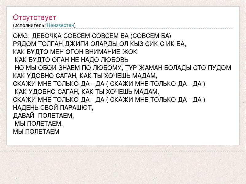 OMG, ДЕВОЧКА СОВСЕМ СОВСЕМ БА (СОВСЕМ БА) РЯДОМ ТОЛГАН ДЖИГИ ОЛАРДЫ ОЛ КЫЗ СИК С ИК БА, КАК БУДТО МЕН ОГОН ВНИМАНИЕ ЖОК КАК БУДТО ОГАН НЕ НАДО ЛЮБОВЬ НО МЫ ОБОИ ЗНАЕМ ПО ЛЮБОМУ, ТУР ЖАМАН БОЛАДЫ СТО ПУДОМ КАК УДОБНО САГАН, КАК ТЫ ХОЧЕШЬ МАДАМ, СКАЖИ МНЕ ТОЛЬКО ДА - ДА ( СКАЖИ МНЕ ТОЛЬКО ДА - ДА ) КАК УДОБНО САГАН, КАК ТЫ ХОЧЕШЬ МАДАМ, СКАЖИ МНЕ ТОЛЬКО ДА - ДА ( СКАЖИ МНЕ ТОЛЬКО ДА - ДА ) НАДЕНЬ СВОЙ ПАРАШЮТ, ДАВАЙ ПОЛЕТАЕМ, МЫ ПОЛЕТАЕМ, МЫ ПОЛЕТАЕМ