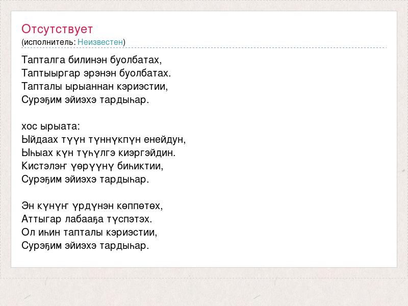 Тапталга билинэн буолбатах, Таптыыргар эрэнэн буолбатах. Тапталы ырыаннан кэриэстии, Сурэҕим эйиэхэ тардыһар. хос ырыата: Ыйдаах түүн түннүкпүн енейдун, Ыһыах күн түһүлгэ киэргэйдин. Кистэлэҥ үөрүүнү биһиктии, Сурэҕим эйиэхэ тардыһар. Эн күнүҥ үрдүнэн көппөтөх, Аттыгар лабааҕа түспэтэх. Ол иһин тапталы кэриэстии, Сурэҕим эйиэхэ тардыһар.