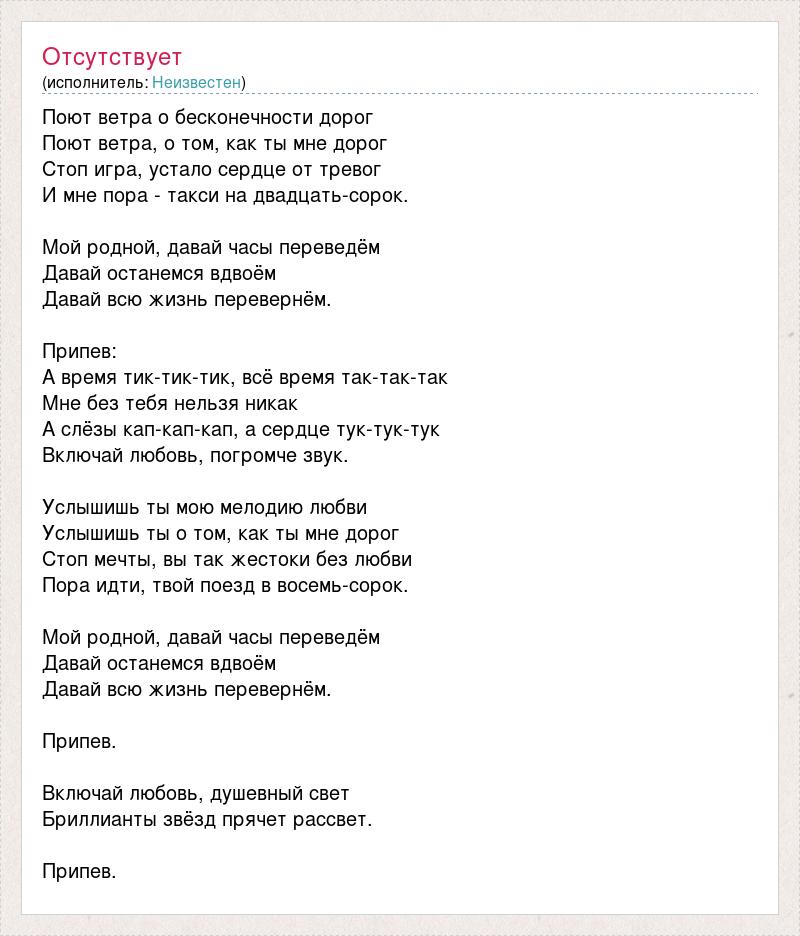 Поют ветра о бесконечности дорог Поют ветра, о том, как ты мне дорог Стоп игра, устало сердце от тревог И мне пора - такси на двадцать-сорок. Мой родной, давай часы переведём Давай останемся вдвоём Давай всю жизнь перевернём. Припев: А время тик-тик-тик, всё время так-так-так Мне без тебя нельзя никак А слёзы кап-кап-кап, а сердце тук-тук-тук Включай любовь, погромче звук. Услышишь ты мою мелодию любви Услышишь ты о том, как ты мне дорог Стоп мечты, вы так жестоки без любви Пора идти, твой поезд в восемь-сорок. Мой родной, давай часы переведём Давай останемся вдвоём Давай всю жизнь перевернём. Припев. Включай любовь, душевный свет Бриллианты звёзд прячет рассвет. Припев.