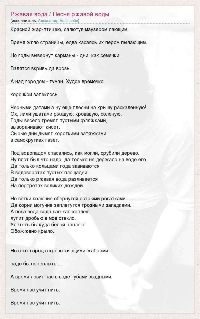 Красной жар-птицею, салютуя маузером лающим, Время жгло страницы, едва касаясь их пером пылающим. Но годы вывернут карманы - дни, как семечки, Bалятся вкривь да врозь. А над городом - туман. Xудое времечко корочкой запеклось. Черными датами а ну еще плесни на крышу раскаленную! Ox, лили ушатами ржавую, кровавую, соленую. Годы весело гремят пустыми фляжками, выворачивают кисет. Сырые дни дымят короткими затяжками в самокрутках газет. Под водопадом спасались, как могли, срубили дерево. Ну плот был что надо, да только не держало на воде его. Да только кольцами года завиваются В водоворотах пустых площадей. Да только ржавая вода разливается На портретах великих дождей. Но ветки колючие обернутся острыми рогатками. Да корни могучие заплетутся грозными загадками. А пока вода-вода кап-кап-каплею лупит дробью в мое стекло. Улететь бы куда белой цаплею! Обожжено крыло. Но этот город с кровоточащими жабрами надо бы переплыть ... А время ловит нас в воде губами жадными. Время нас учит пить. Время нас учит пить.