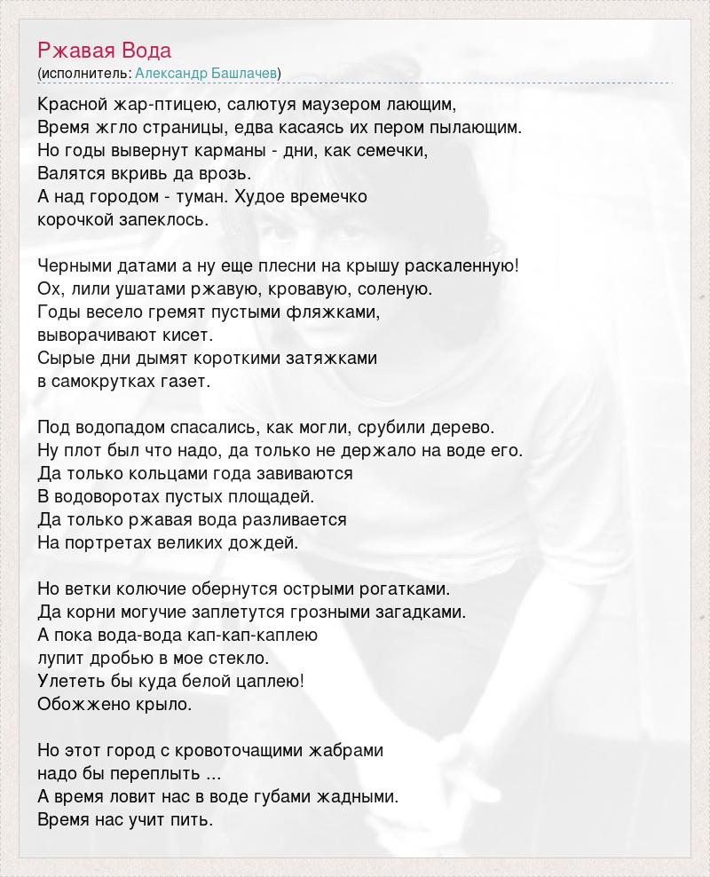 Красной жар-птицею, салютуя маузером лающим, Время жгло страницы, едва касаясь их пером пылающим. Но годы вывернут карманы - дни, как семечки, Bалятся вкривь да врозь. А над городом - туман. Xудое времечко корочкой запеклось. Черными датами а ну еще плесни на крышу раскаленную! Ox, лили ушатами ржавую, кровавую, соленую. Годы весело гремят пустыми фляжками, выворачивают кисет. Сырые дни дымят короткими затяжками в самокрутках газет. Под водопадом спасались, как могли, срубили дерево. Ну плот был что надо, да только не держало на воде его. Да только кольцами года завиваются В водоворотах пустых площадей. Да только ржавая вода разливается На портретах великих дождей. Но ветки колючие обернутся острыми рогатками. Да корни могучие заплетутся грозными загадками. А пока вода-вода кап-кап-каплею лупит дробью в мое стекло. Улететь бы куда белой цаплею! Обожжено крыло. Но этот город с кровоточащими жабрами надо бы переплыть ... А время ловит нас в воде губами жадными. Время нас учит пить.